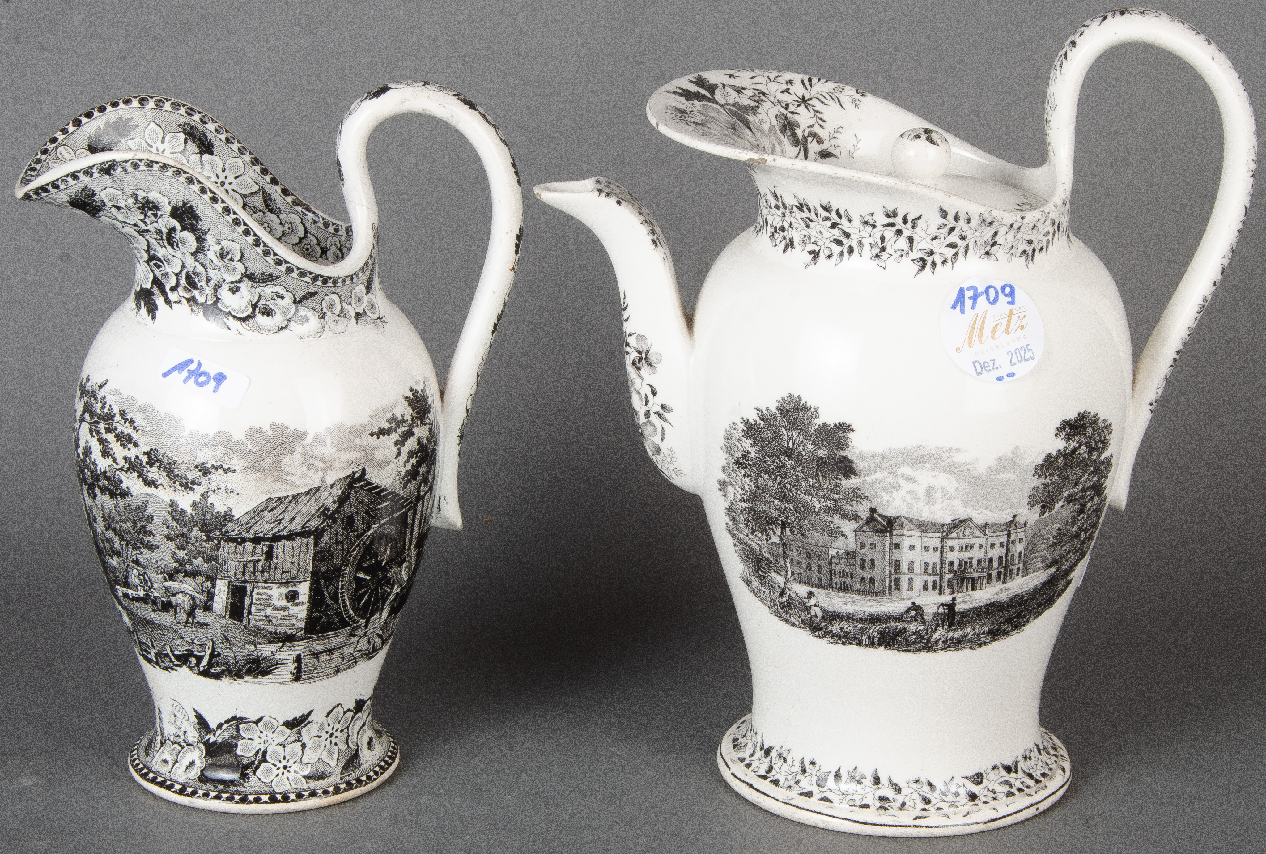 - Katalog-Nr: 1709Kaffeekanne und Milchgießer. Wohl Grünstadt um 1880. Feinsteinzeug, mit Umdruckdekor; ohne Marke, H=21 / 22 cm. (best.)o.L.