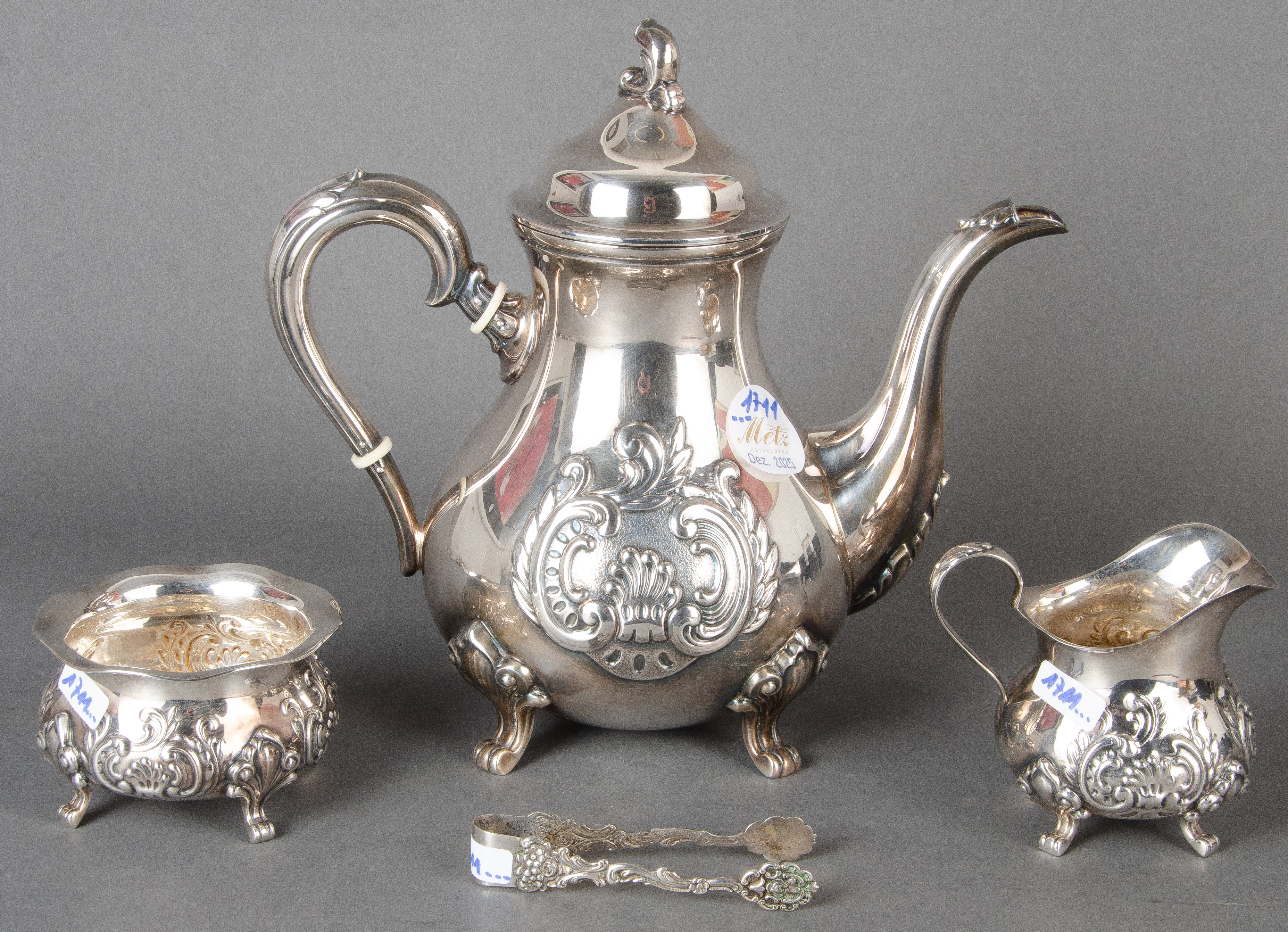 - Katalog-Nr: 1711Dreitlgs. Kaffeeservice. Kopenhagen 20. Jh. 925er Sterlingsilber, ca. 900 g, am Boden gepunzt. Bestehend aus: Eine Kaffeekanne (H=22 cm), ein Milchgießer (H=8 cm) und eine Zuckerdose (H=6 cm); dazu eine Zuckerzange.o.L.