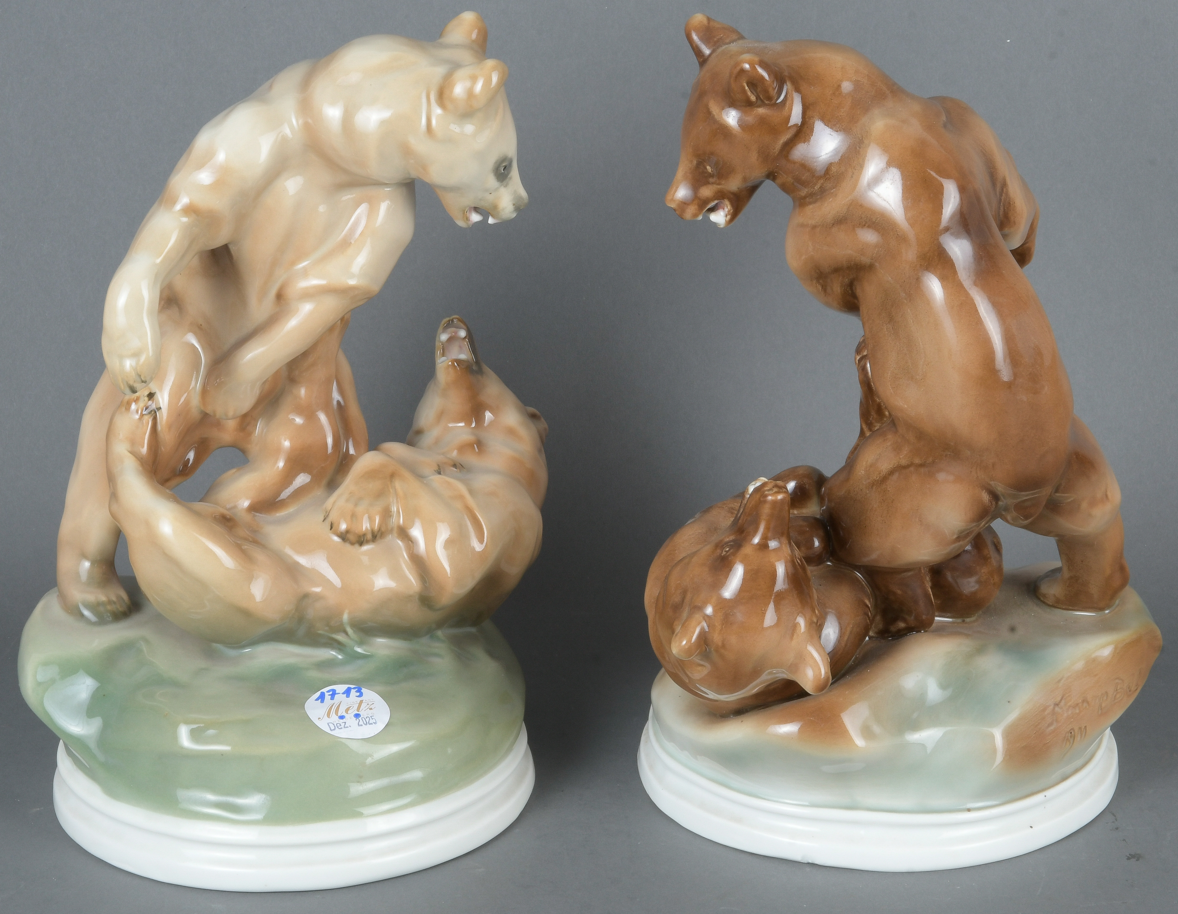 - Katalog-Nr: 1713Zwei Bärengruppen. Zsolnay 20. Jh. Porzellan, bunt bemalt; am Boden gemarkt, H=28,5 / 29 cm.o.L.