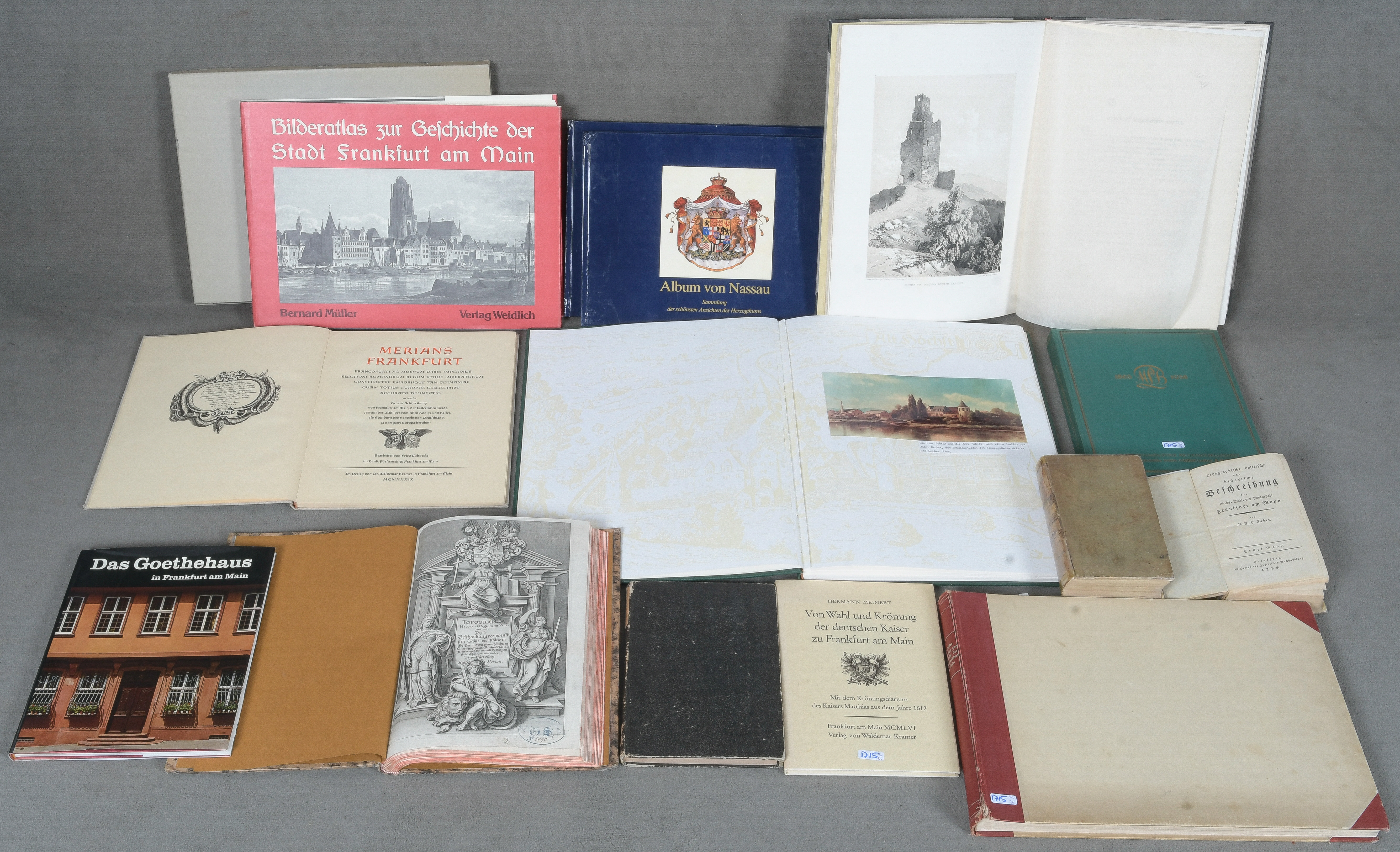 - Katalog-Nr: 1715Konvolut Literatur über Frankfurt a./M. und Nassau, u.a. Bernhard Müller, „Bilderatlas zur Geschichte Frankfurts“, Frankfurt 1916; D.J.H. Faber, „Topographische, politische und historische Beschreibunt der REichs-, Wahl, und Handelsstadt Frankfurt a./M.“, zwei Bde., Frankfurt 1789.o.L.