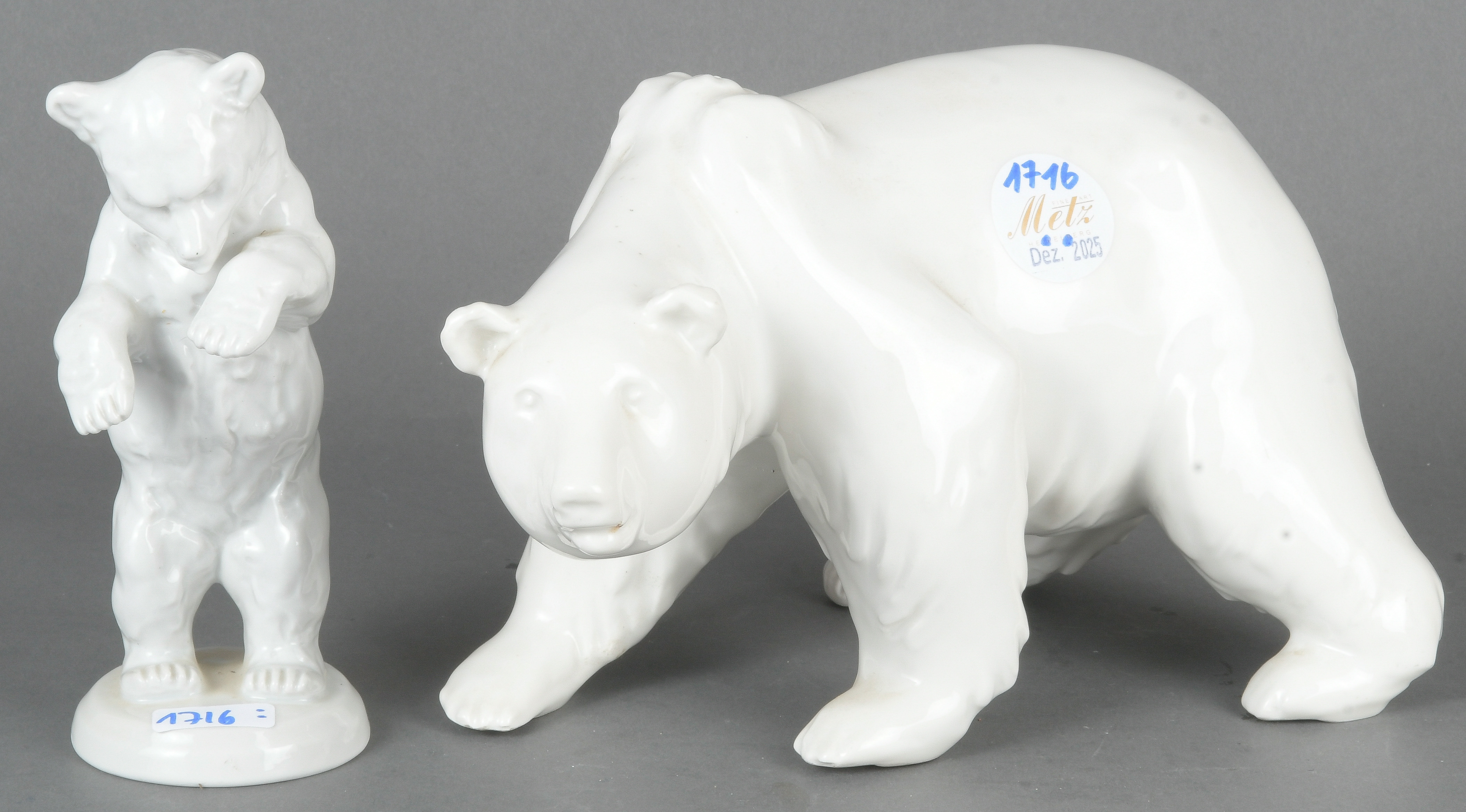 - Katalog-Nr: 1716Zwei Bären. Berlin / Schaubach 20. Jh. Porzellan, weiß glasiert; am Boden gemarkt, H=14 / 15,5 cm.o.L.