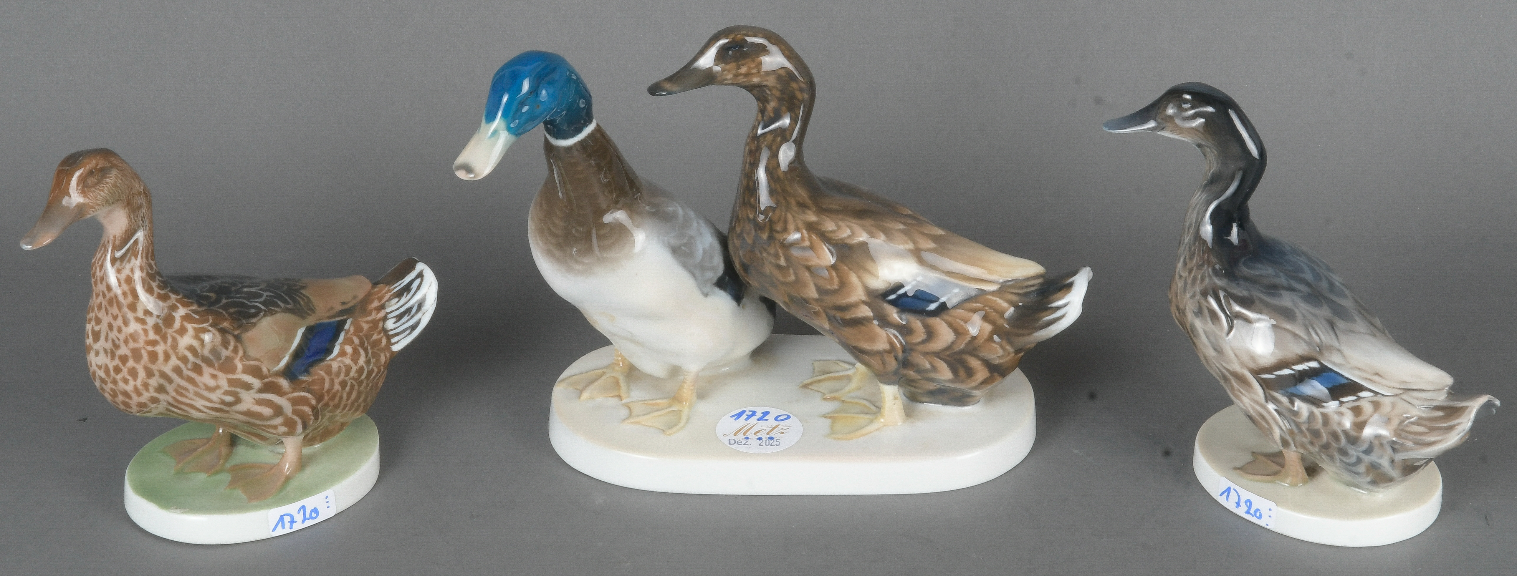 - Katalog-Nr: 1720Zwei Enten und eine Entengruppe. Rosenthal 20. Jh. Porzellan, bunt bemalt; am Boden gemarkt, teilw. mit Formnummer „K352“, je Entwurf und sign. W.(ilhelm) Zügel, H=13,5 bis 17 cm. (eine min. best.)o.L.