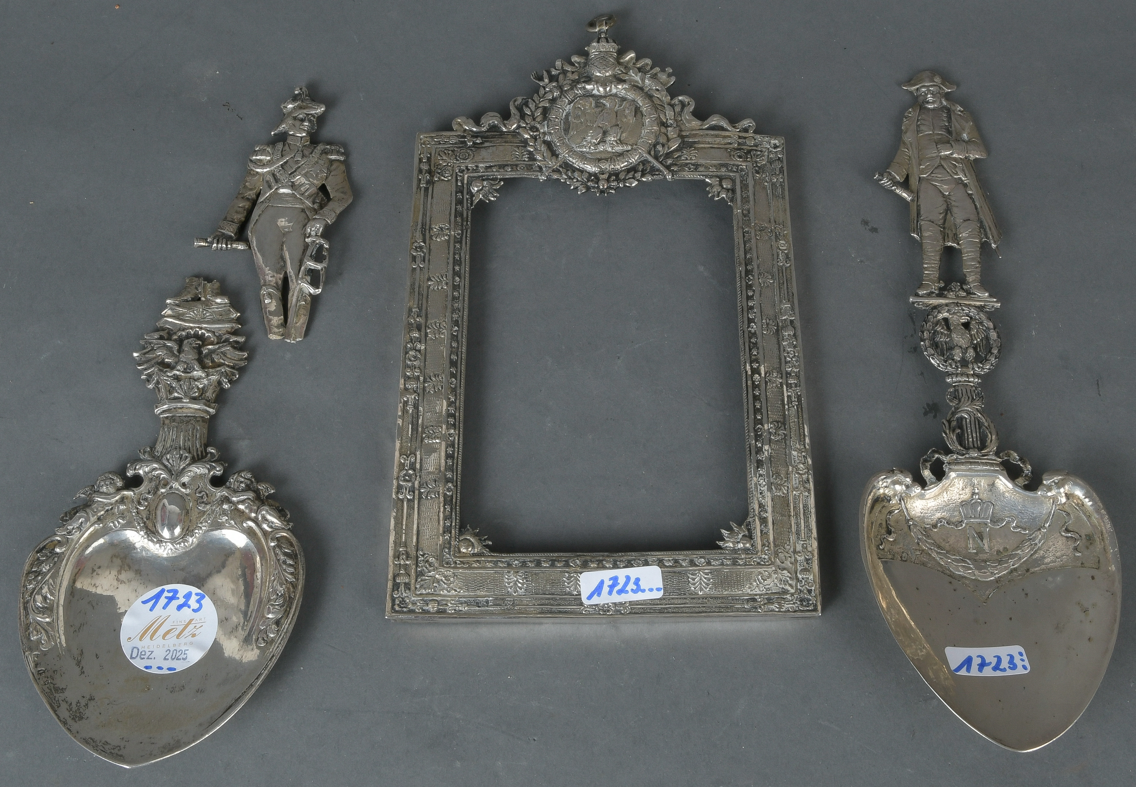 - Katalog-Nr: 1723Paar Prunklöffel und Rahmen. Wohl Hanau, Neresheimer um 1900. Silber, ca. 473 g, mit unterschiedlichen Phantasiemarken, Löffel: L=26 cm / Rahmen: 22,5 x 13,5 cm. (ein Löffel gebrochen)o.L.
