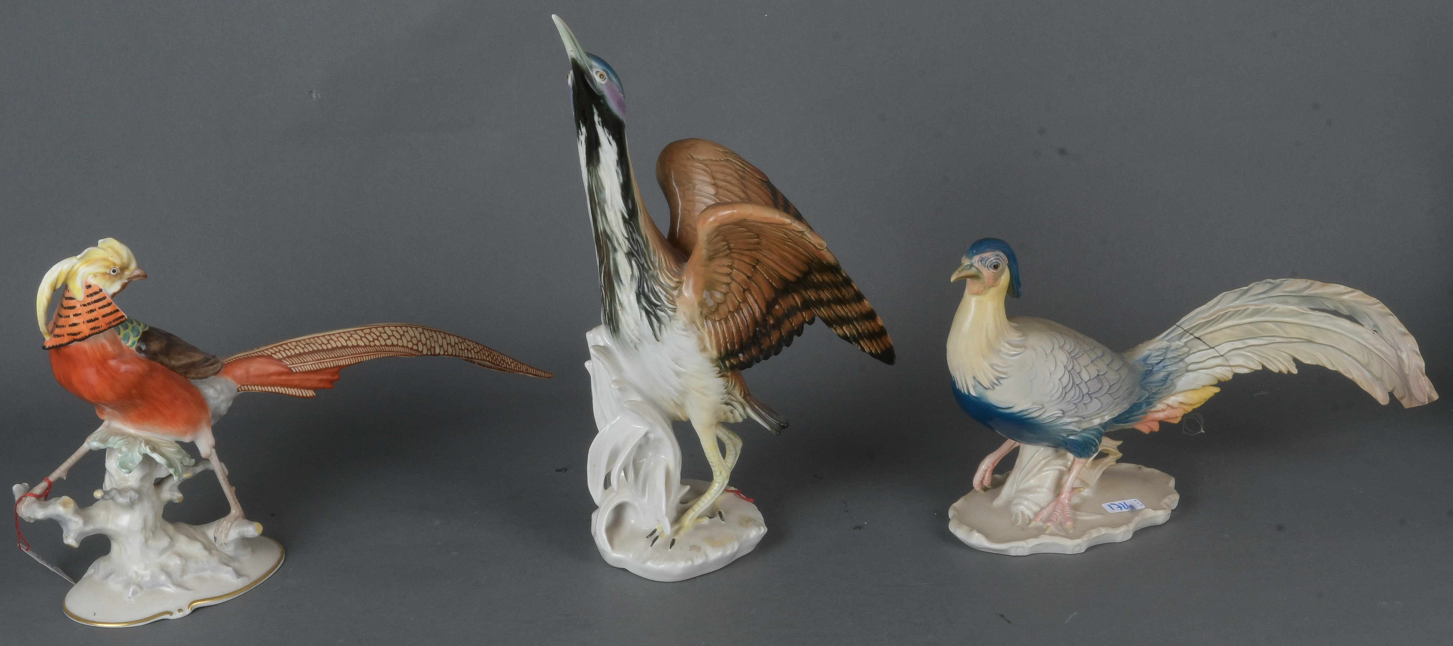- Katalog-Nr: 1724Zwei Fasane und ein Kranich. Volkstedt-Ens 20. Jh. Porzellan, bunt bemalt; am Boden gemarkt, H=18,5 bis 32 cm. (teilw. besch.)o.L.