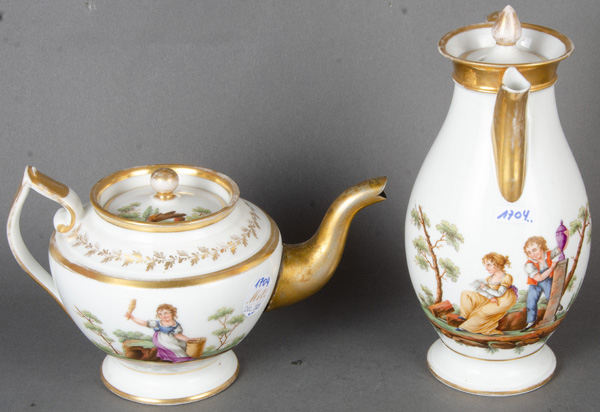 - Katalog-Nr: 1704Kaffee- und Teekanne. Paris 19. Jh. Porzellan, bunt bemalt mit Kindern in Landschaft, Goldrand; ohne Marke, H=14,5 / 24 cm. (Tülle der Teekanne aus Metall ergänzt / rest. / Gold berieben)o.L.