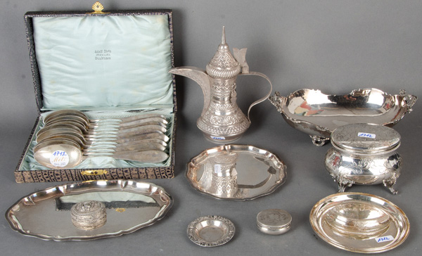 - Katalog-Nr: 1712Konvolut Silber, ca. 1.600 g, und Versilbertes. Deutsch 20. Jh. Bestehend aus: Zwölf Suppenlöffel im Etui, Schalen, Tabletts und Zuckerdose.o.L.