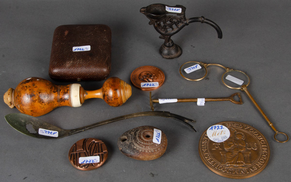 - Katalog-Nr: 1722Zehntlgs. Konvolut unterschiedlicher Gebrauchsgegenstände: Eine Öllampe aus Eisen (H=8,5 cm), ein Bronze-Miniaturrechen (H=13 cm), ein Messinglöffel (L=26 cm), ein Taschenuhrenetui, drei Bronzemedaillen (D=5 bis 9 cm), Lorgnon aus Messing und Nussknacker aus Holz (H=18 cm).o.L.