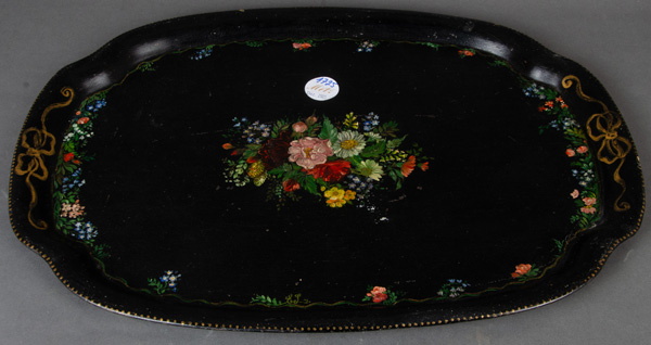 - Katalog-Nr: 1725Serviertablett. England um 1900. Blech, schwarz lackiert und bunt floral bemalt, Goldrand, H=2,5 cm, B=50, cm, T=37 cm.o.L.