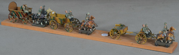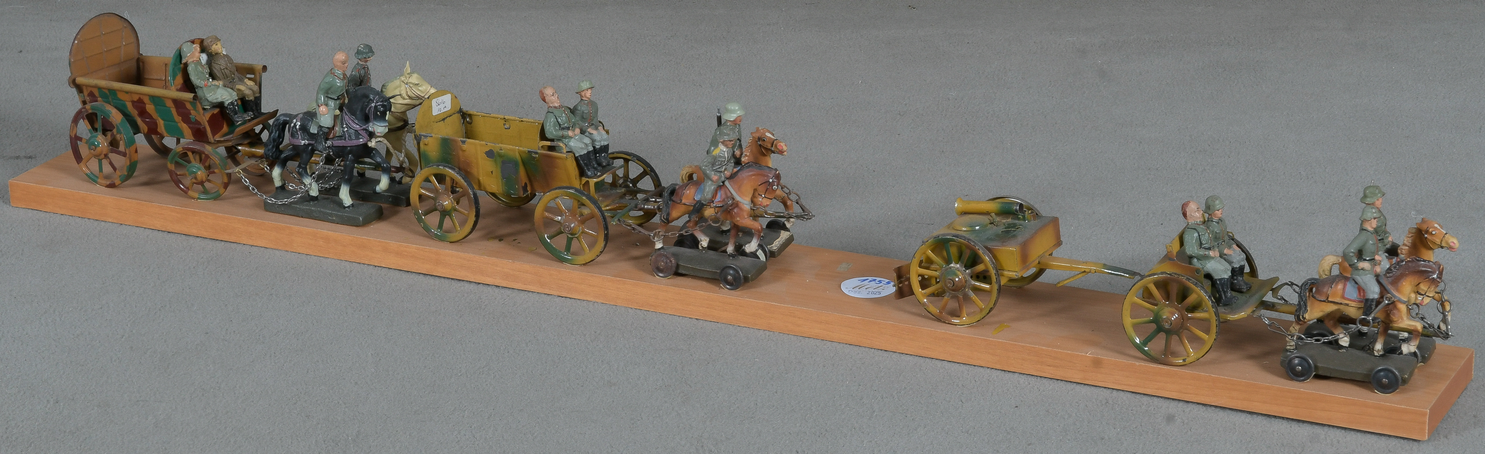 - Katalog-Nr: 1755Zwölf Spielzeug-Soldaten, Feldküche und zwei Feldwagen. Deutsch 20. Jh. Blech, bemalt / Elastolin, auf Holzbrett befestigt, H=9 cm, B=86 cm, T=11 cm. (teilw. best.)o.L.