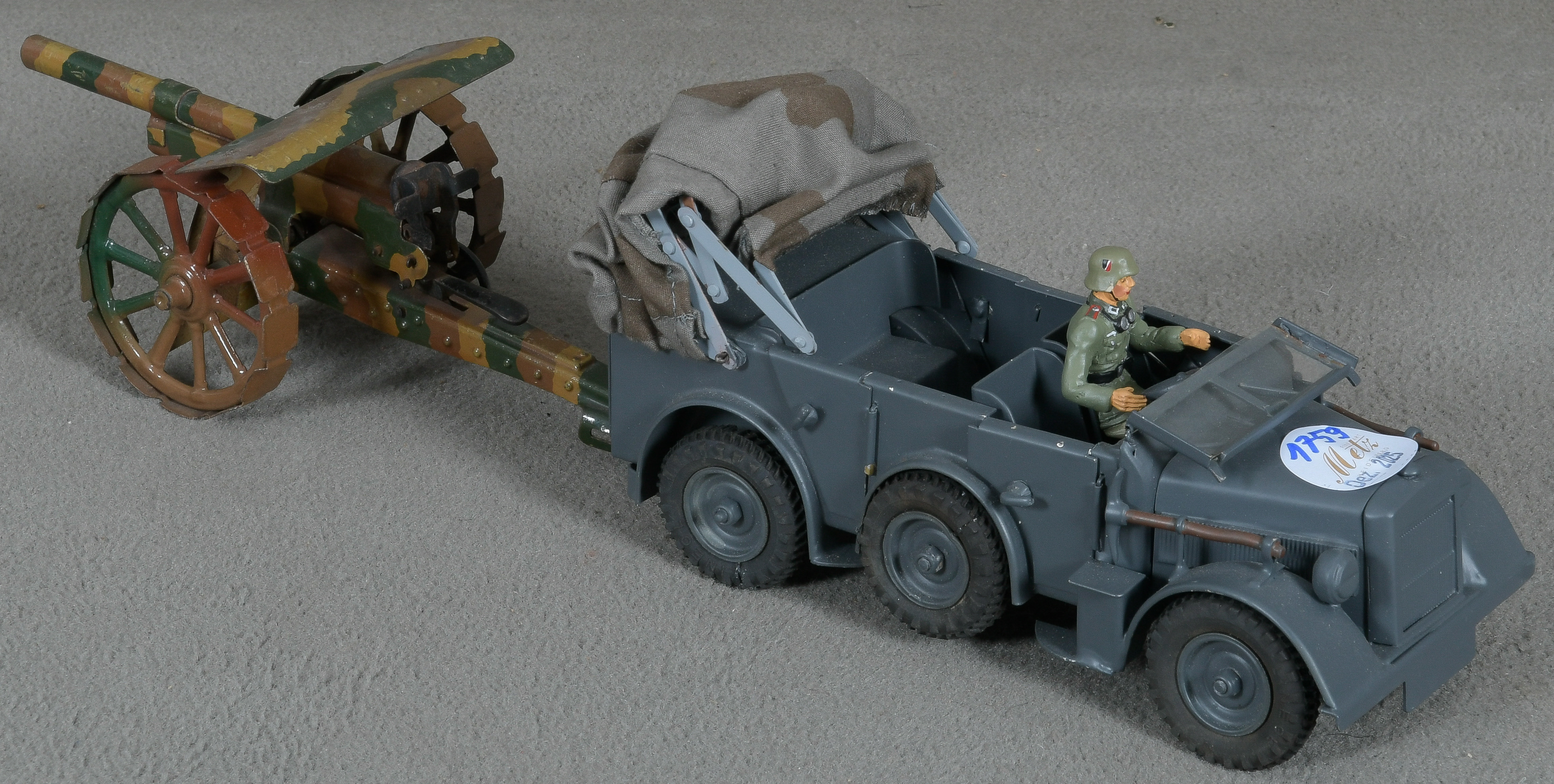- Katalog-Nr: 1759Kübelwagen mit Artillerie und Fahrer. Deutsch 20. Jh. Blech, bemalt / Elastolin, H=9 cm, B=41 cm, T=9 cm.o.L.