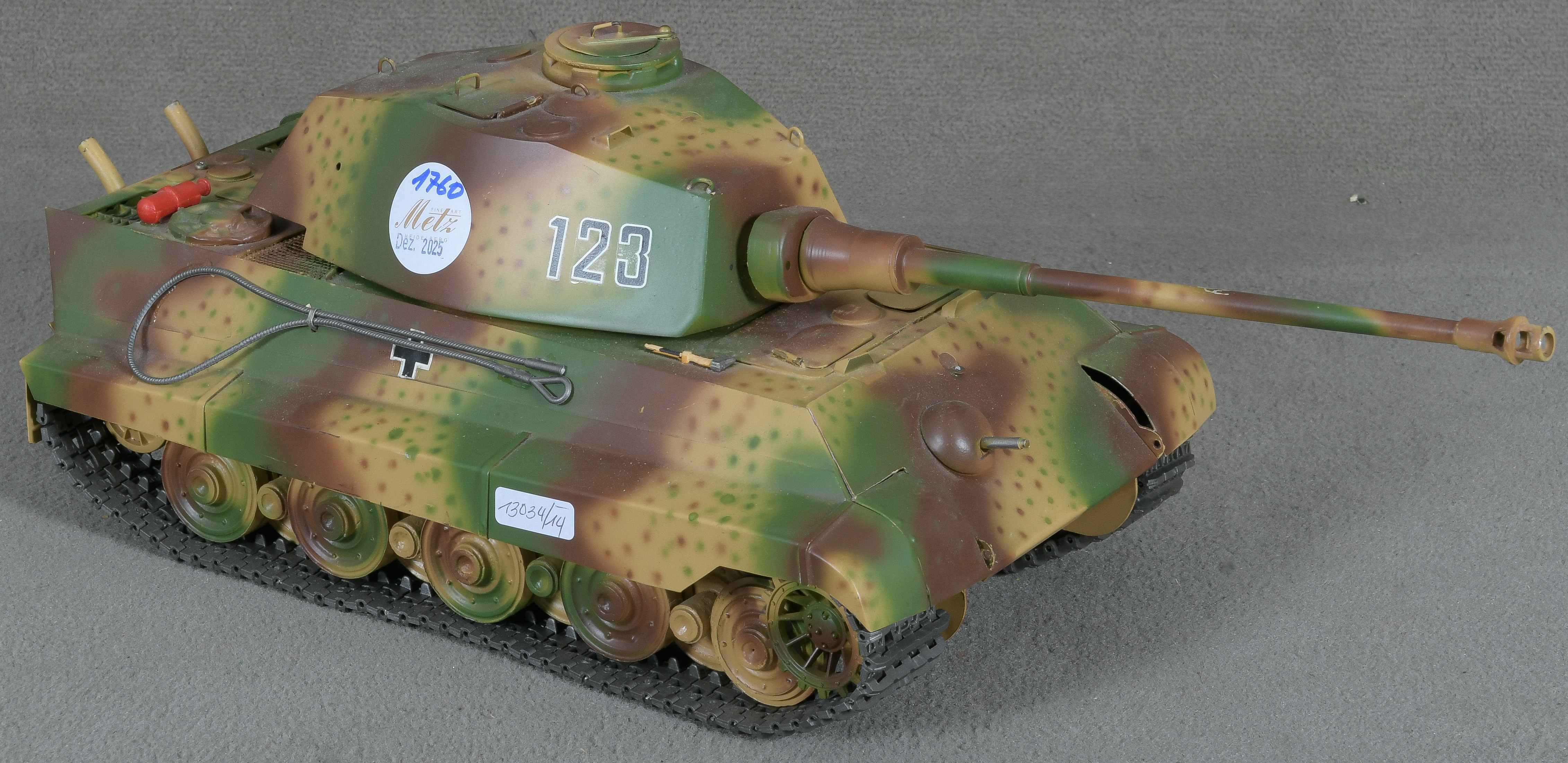 - Katalog-Nr: 1760Panzer, wohl „Königstiger“. Deutsch 20. Jh. Blech, in Tarnfarben bemalt, H=14,5 cm, B=44 cm, T=17,5 cm.o.L.