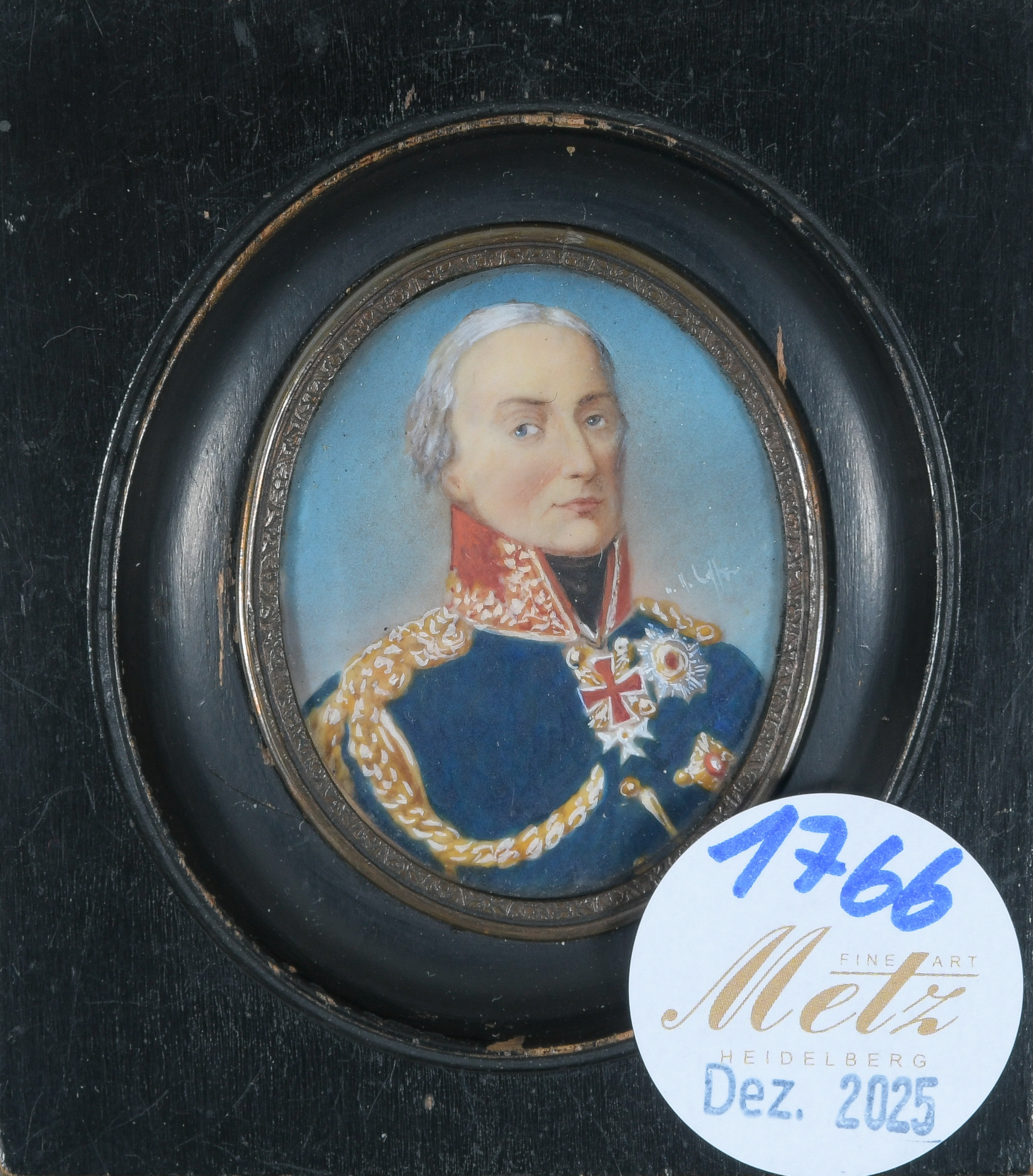 - Katalog-Nr: 1766Miniatur mit dem Porträt von General Bülow von Dennewitz, gerahmt, 4,5 x 3,5 cm.o.L.