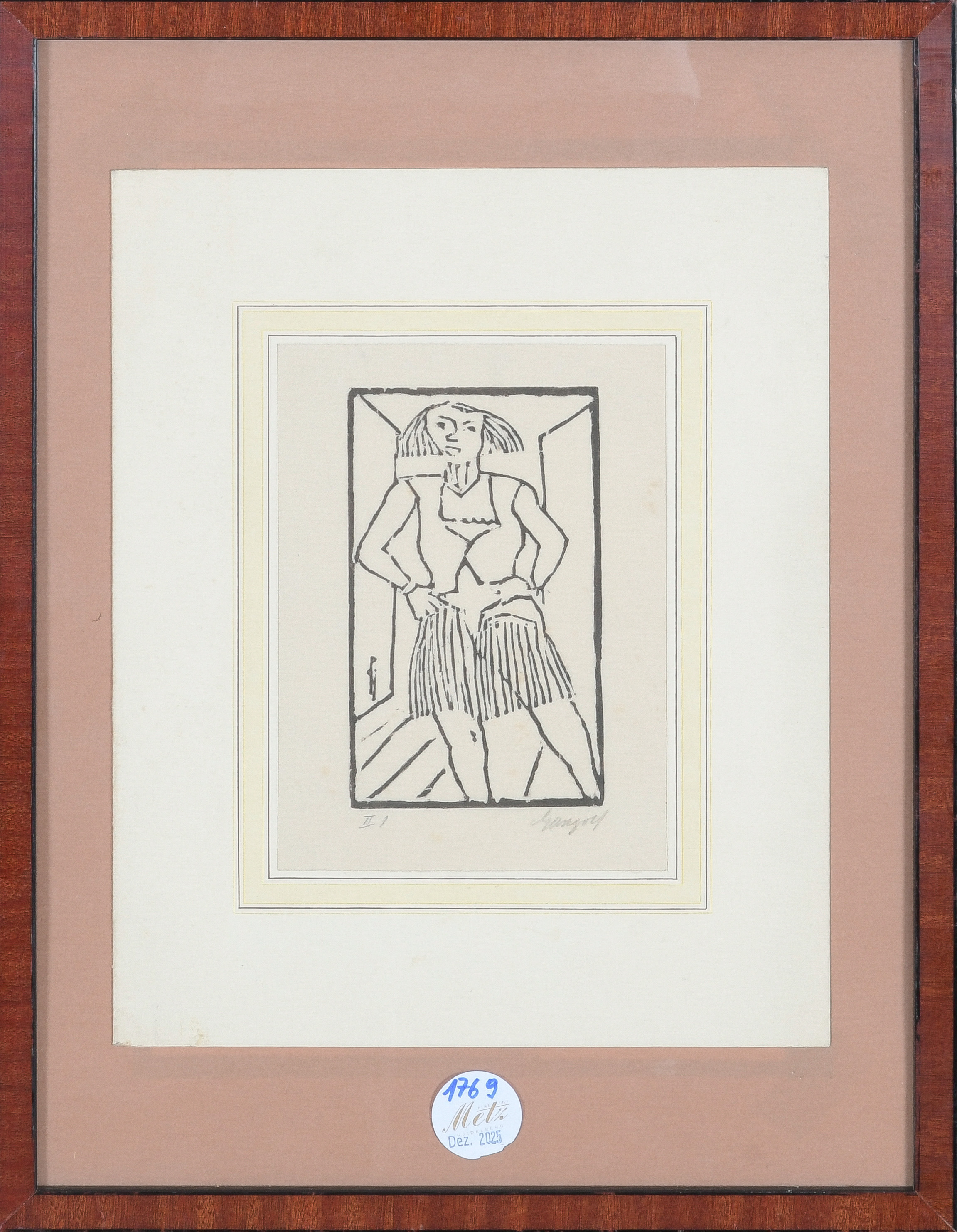 - Katalog-Nr: 1769Paul Gangolf (1879-1939). Frauenporträt. Holzschnitt, re./u./sign., mit Passepartout hi./Gl. gerahmt, 14,5 x 8,5 cm.o.L.