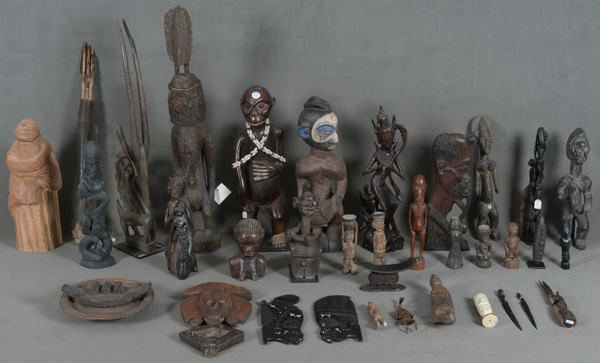 - Katalog-Nr: 1751Konvolut Kultfiguren und -gegenstände. Afrika. Massivholz, geschnitzt / Stein, behauen, teilw. bemalt, H=25 bis 92 cm.o.L.