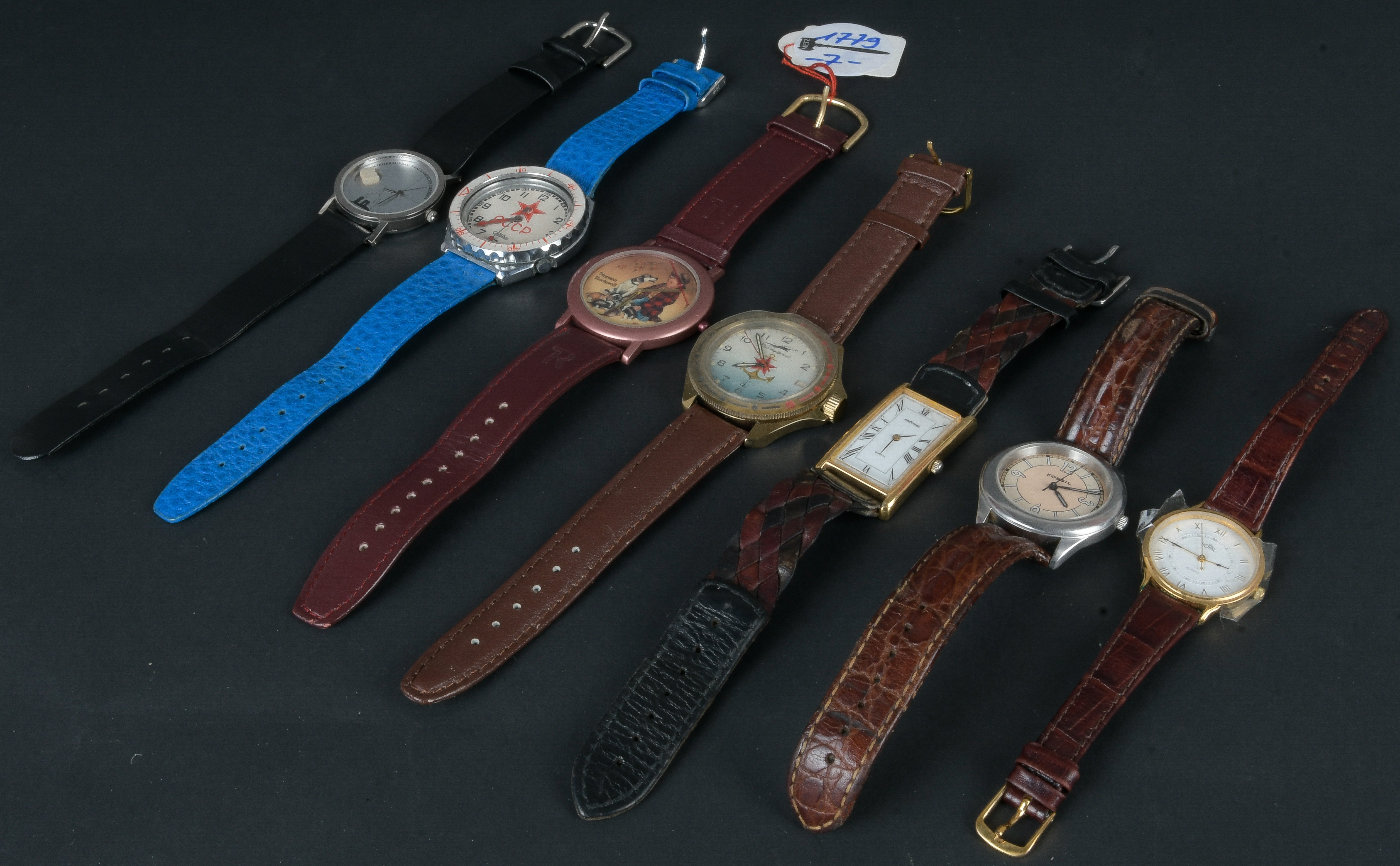 - Katalog-Nr: 1779Sieben Herrenarmbanduhren, u.a. „Fossil“, „Pratina“ und „Royal“. (Funktion ungeprüft)o.L.
