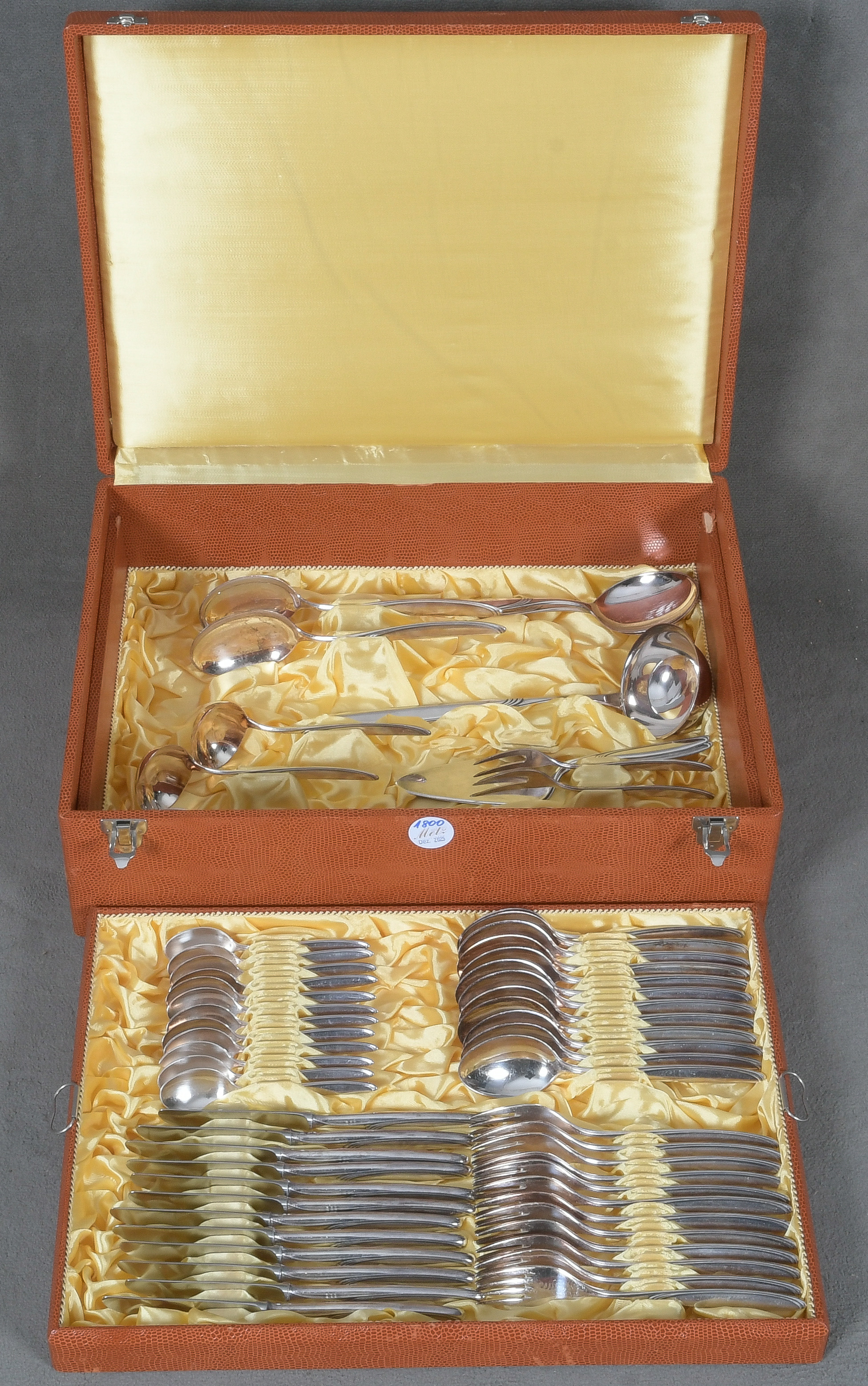 - Katalog-Nr: 180072-tlgs. Speisebesteck für 12 Personen mit Beilegebestecken im Koffer. Metallwarenfabrik Nagold 20. Jh. Versilbert mit 100er Auflage.o.L.