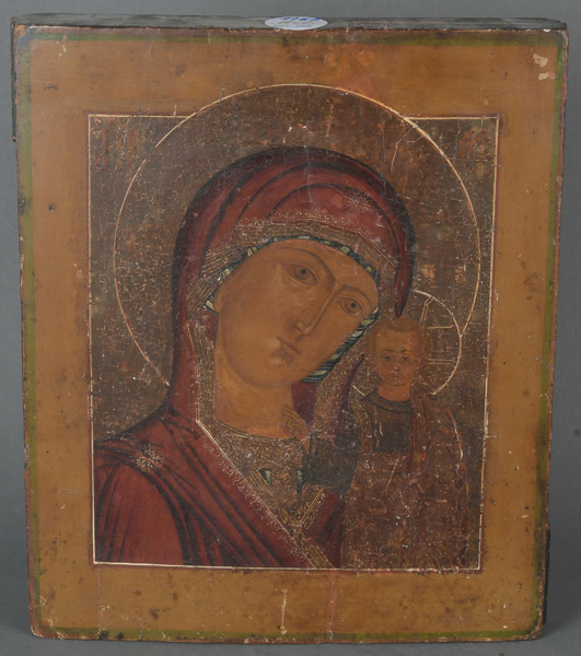 - Katalog-Nr: 1782Ikone mit der Muttergottes. Russland 19. Jh. Massivholz, auf Kreidegrund farbig bemalt, 32 x 26,5 cm.o.L.