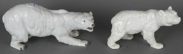 - Katalog-Nr: 1783Zwei Bären. Schaubach / wohl Thüringen 20. Jh. Porzellan, bunt bemalt; teilw. am Boden gemarkt, H=13 / 13,5 cm.o.L.