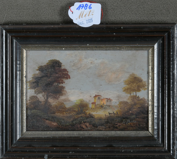 - Katalog-Nr: 1786Luigi Bisi (1814-1886). Südländische Landschaft mit Gebäude. Öl/Malkarton, re./u./sign., gerahmt, 11,5 x 16 cm.o.L.