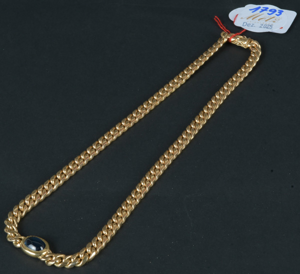 - Katalog-Nr: 1793Gliederhalskette. 18 kt Gold, besetzt mit Saphircabochon, Gesamtgewicht ca. 83,10 g, L=40 cm.o.L.