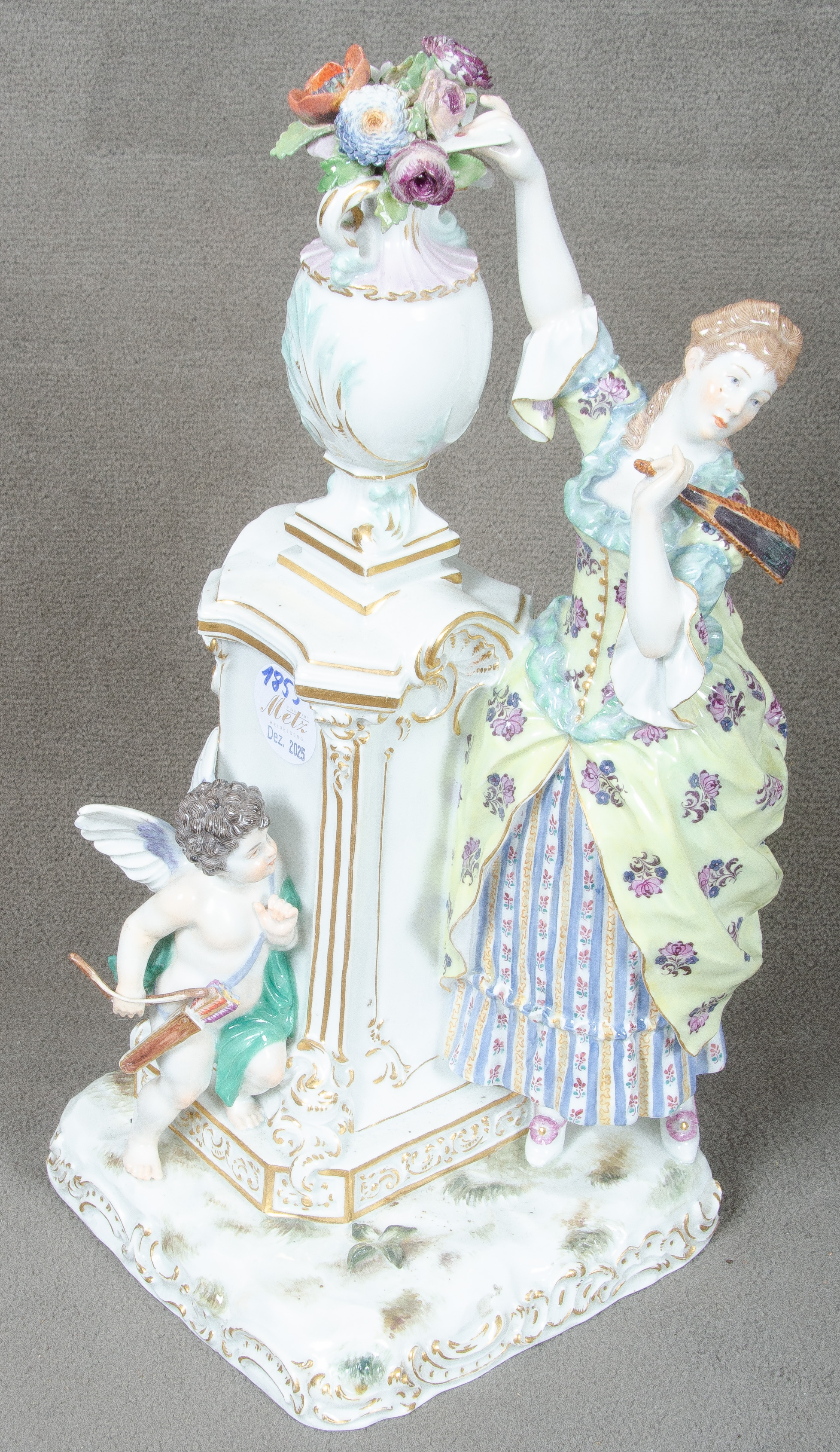 - Katalog-Nr: 1853Große Gruppe einer Dame mit Fächer und Amor. Meissen 20. Jh. Porzellan, aufwendig modelliert und staffiert; am Boden unterglasurblaue Schwertermarke, Formnummer „O180“, Staffiererziffer „10“, Modell von Friedrich Offermann, H=38 cm.o.L.