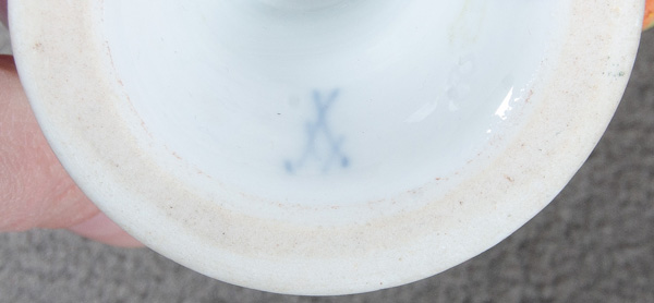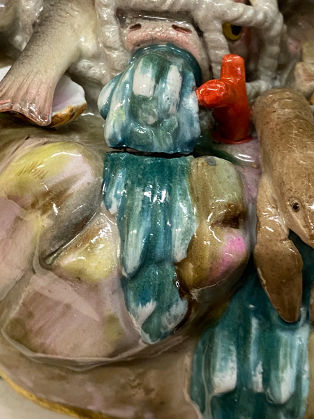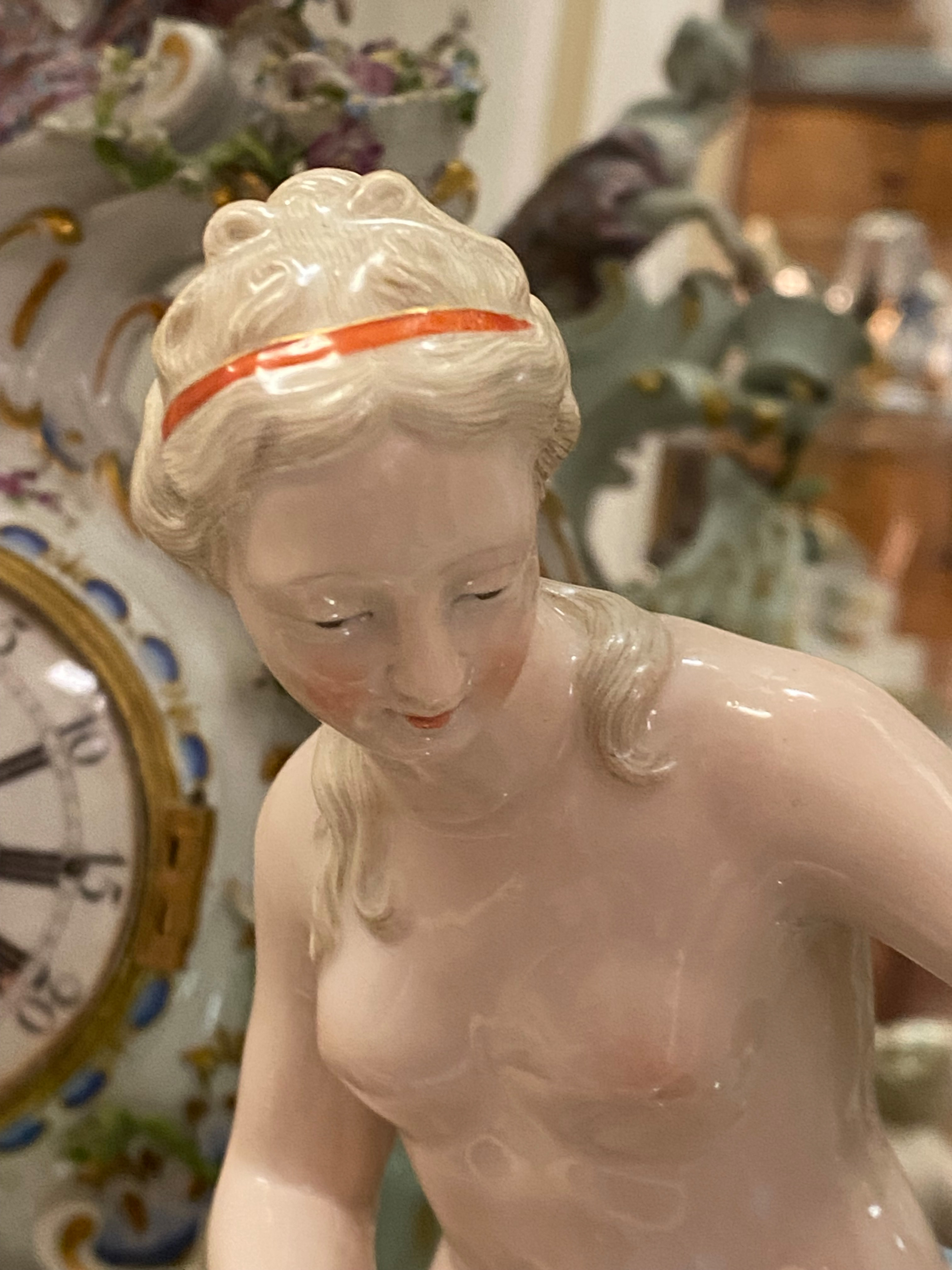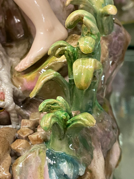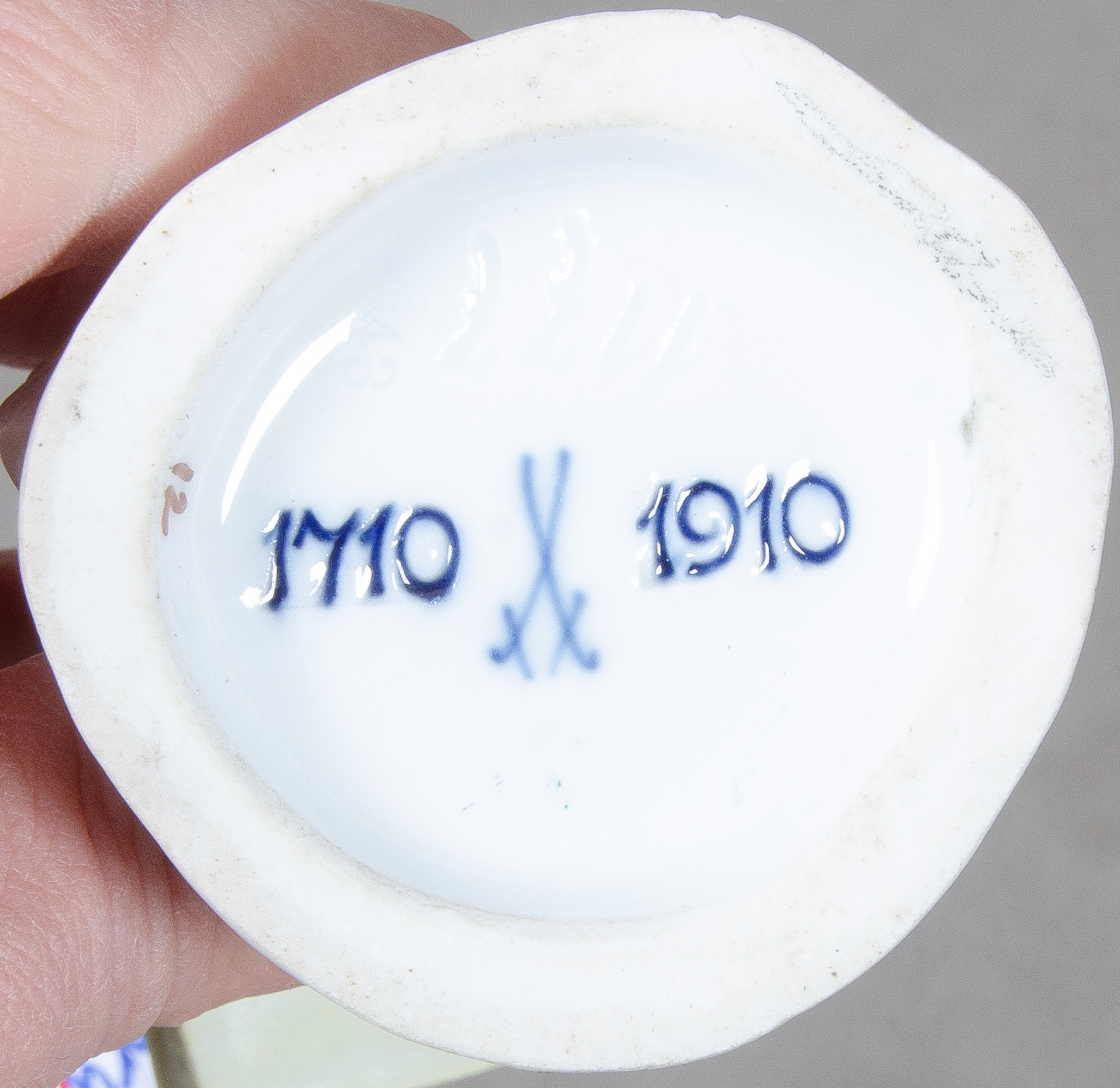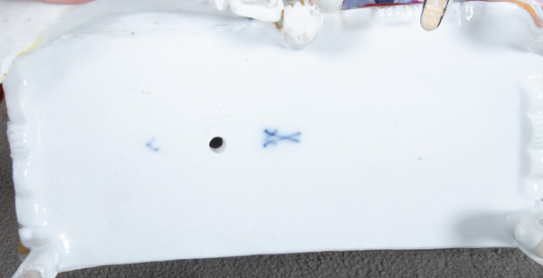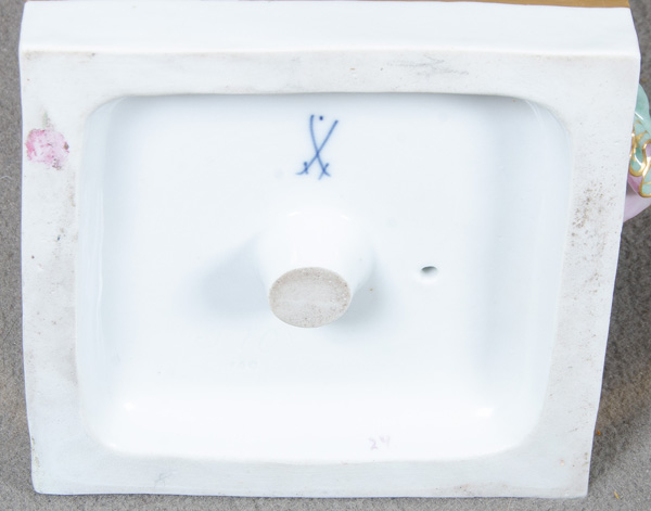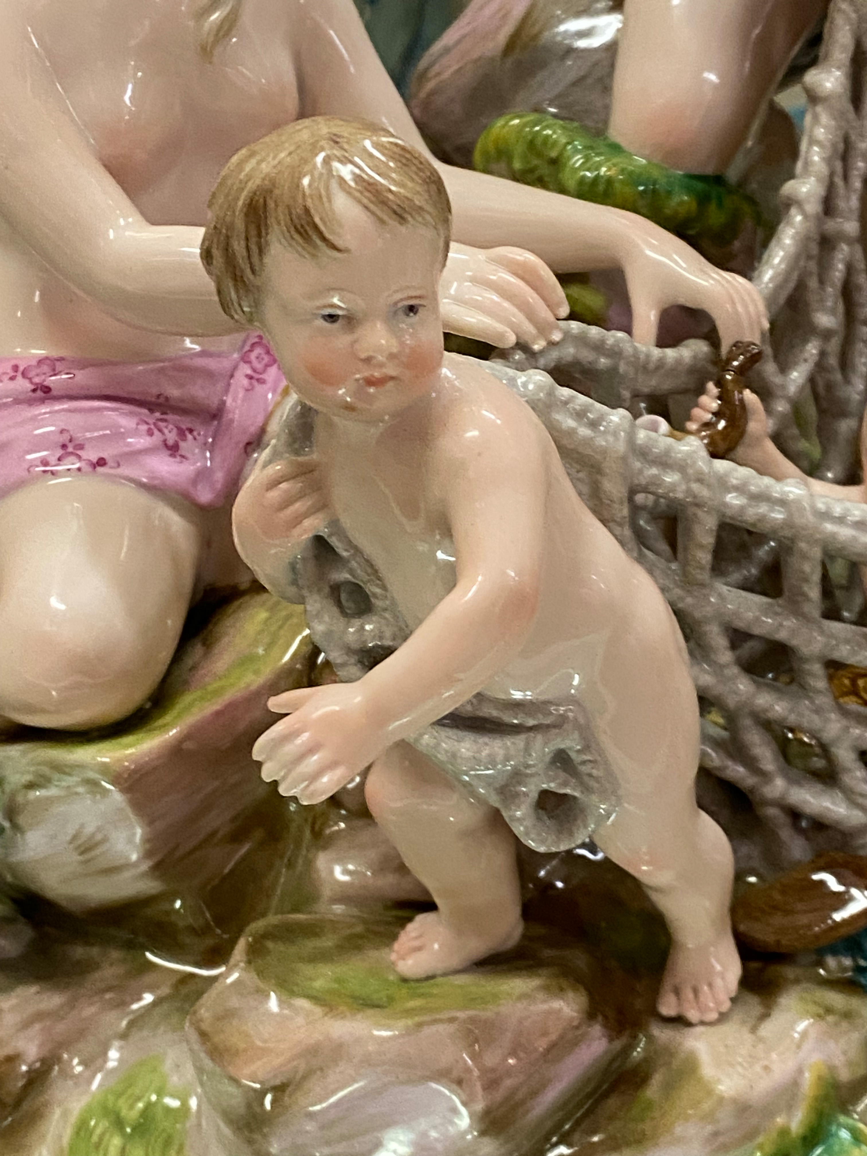 - Katalog-Nr: 1855Tritonenfang. Meissen 19. Jh. Porzellan, bunt bemalt; am Boden unterglasurblaue Schwertermarke, Formnummer „C35“, Modell nach Johann Carl Schönheit, H=32 cm.o.L.