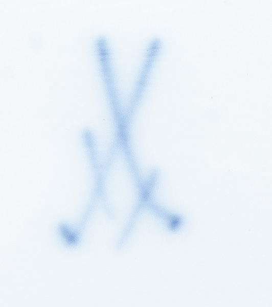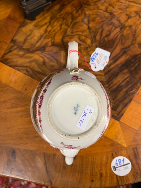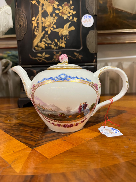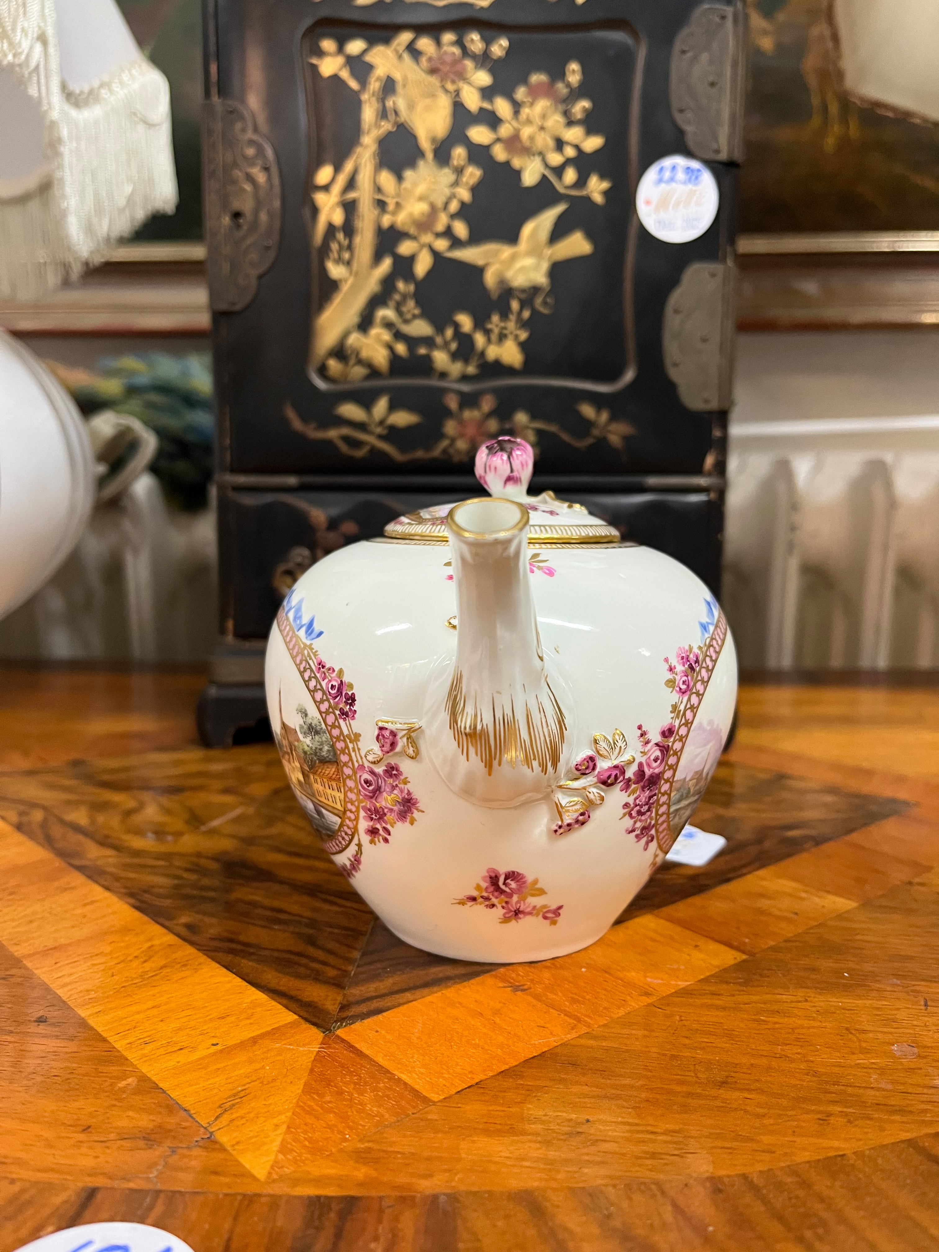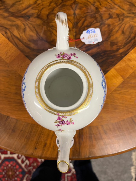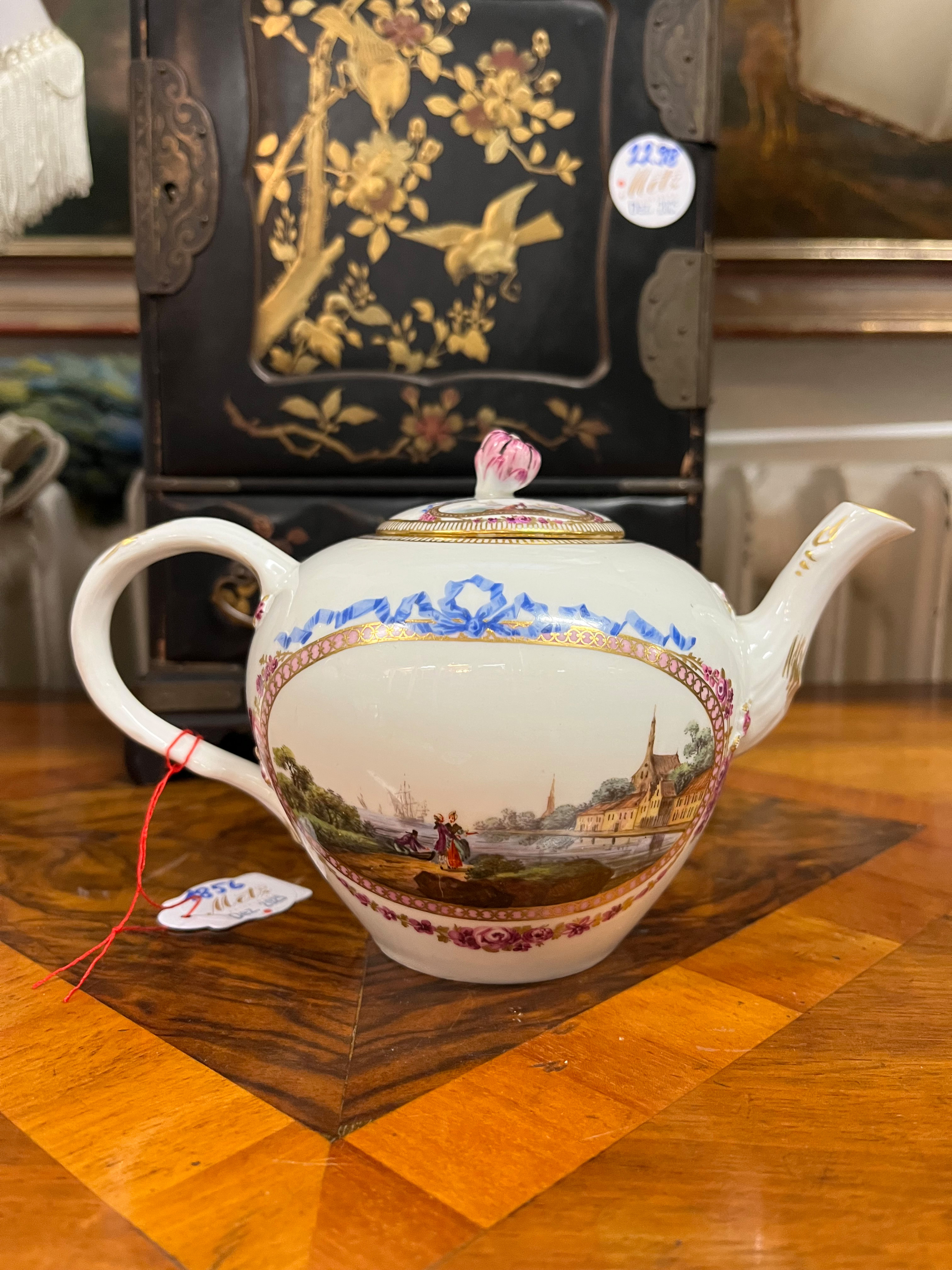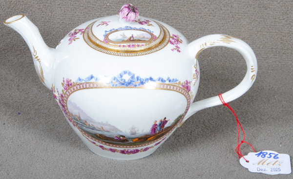 - Katalog-Nr: 1856Teekanne. Meissen-Marcolini 1774-1814. Porzellan, bunt bemalt mit Uferlandschaft, gold gesäumt sowie Ketten- und Floraldekor; Porzellan, am Boden unterglasurblaue Schwertermarke mit Stern, H=10,5 cm.o.L.