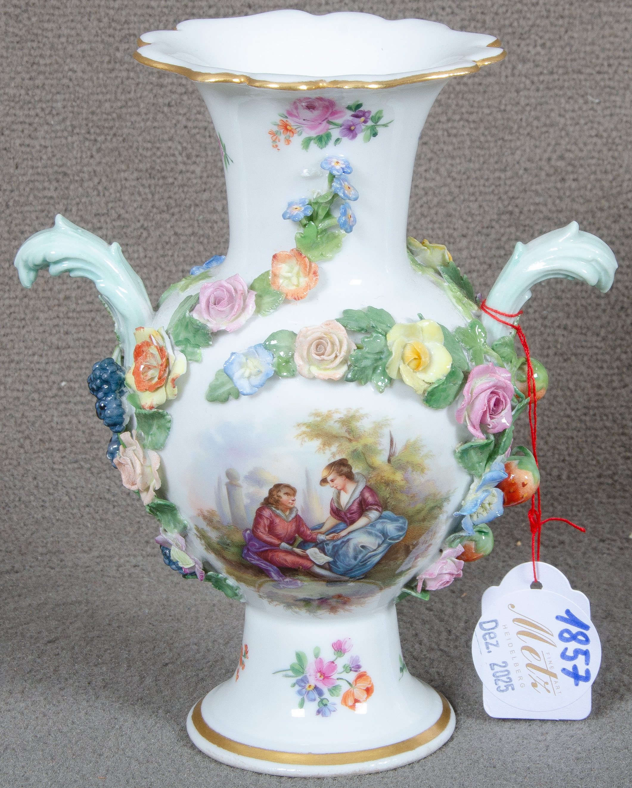 - Katalog-Nr: 1857Prunkvase. Meissen 19. Jh. Porzellan, aufwendig reliefiert mit Blüten und Blättern, Reserven bunt bemalt mit Watteauszenen und Blumenbouquets; am Boden unterglasurblaue Schwertermarke, D=16,2 cm. (min. rest.)o.L.