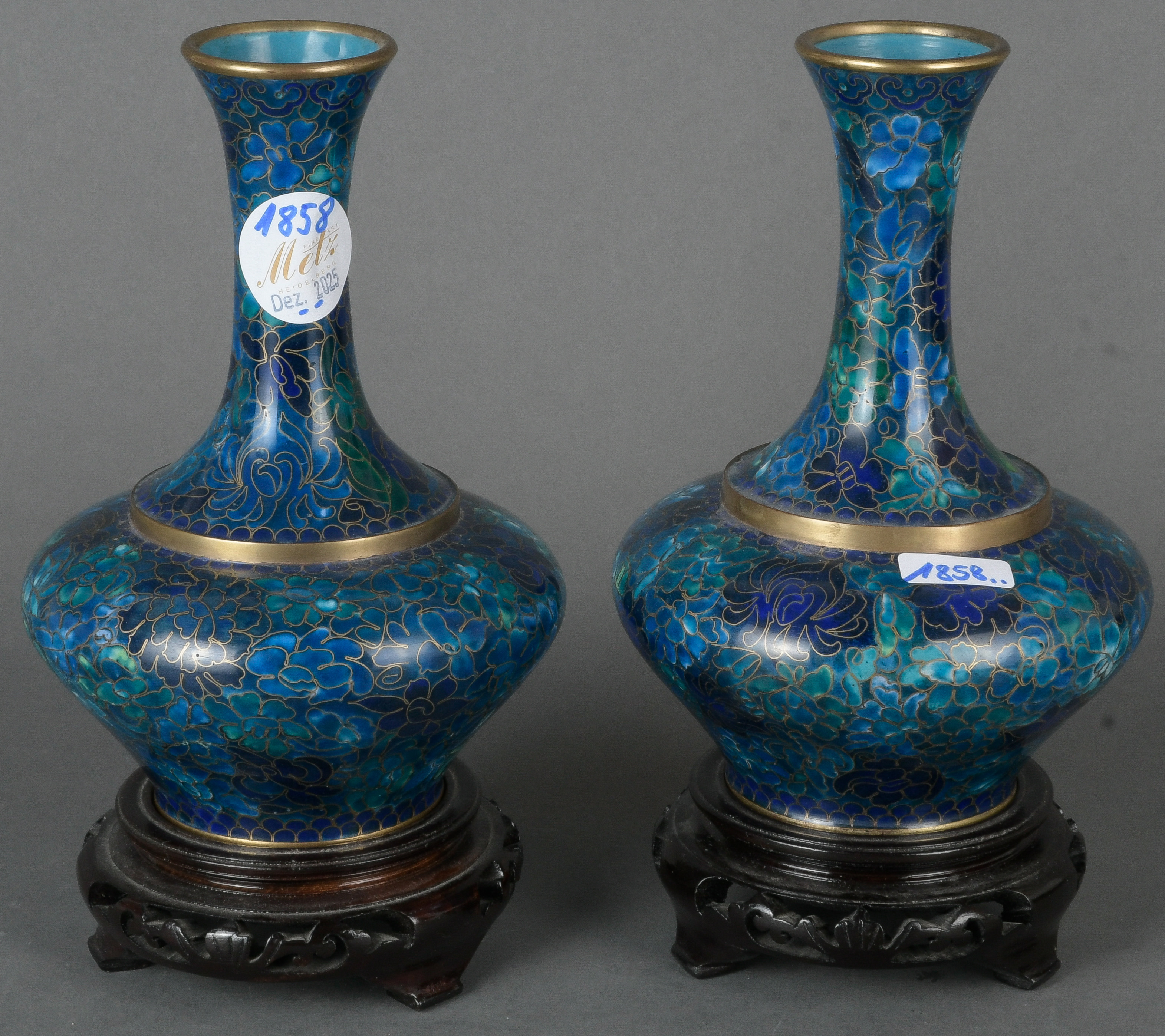 - Katalog-Nr: 1858Zwei Vasen auf Holzsockel. Asien. Messing, bunt emailliert, H=je 22 cm.o.L.
