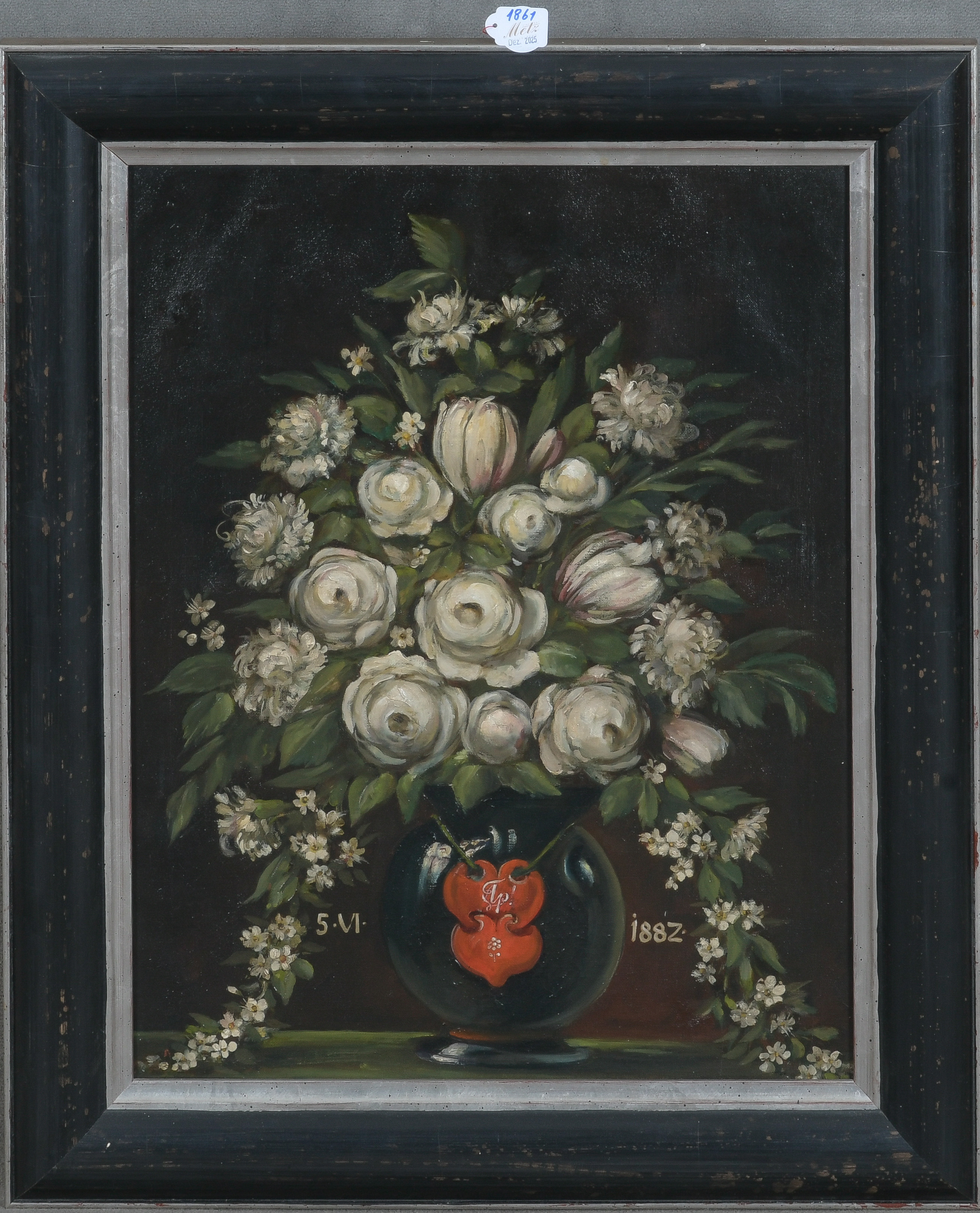 - Katalog-Nr: 1861Maler des 19./20. Jhs. Blumenstrauß mit weißen Rosen und Tulpen in Vase. Öl/Lw., li./u. unleserlich sign./dat. 1882, gerahmt, 60,5 x 46,5 cm.o.L.