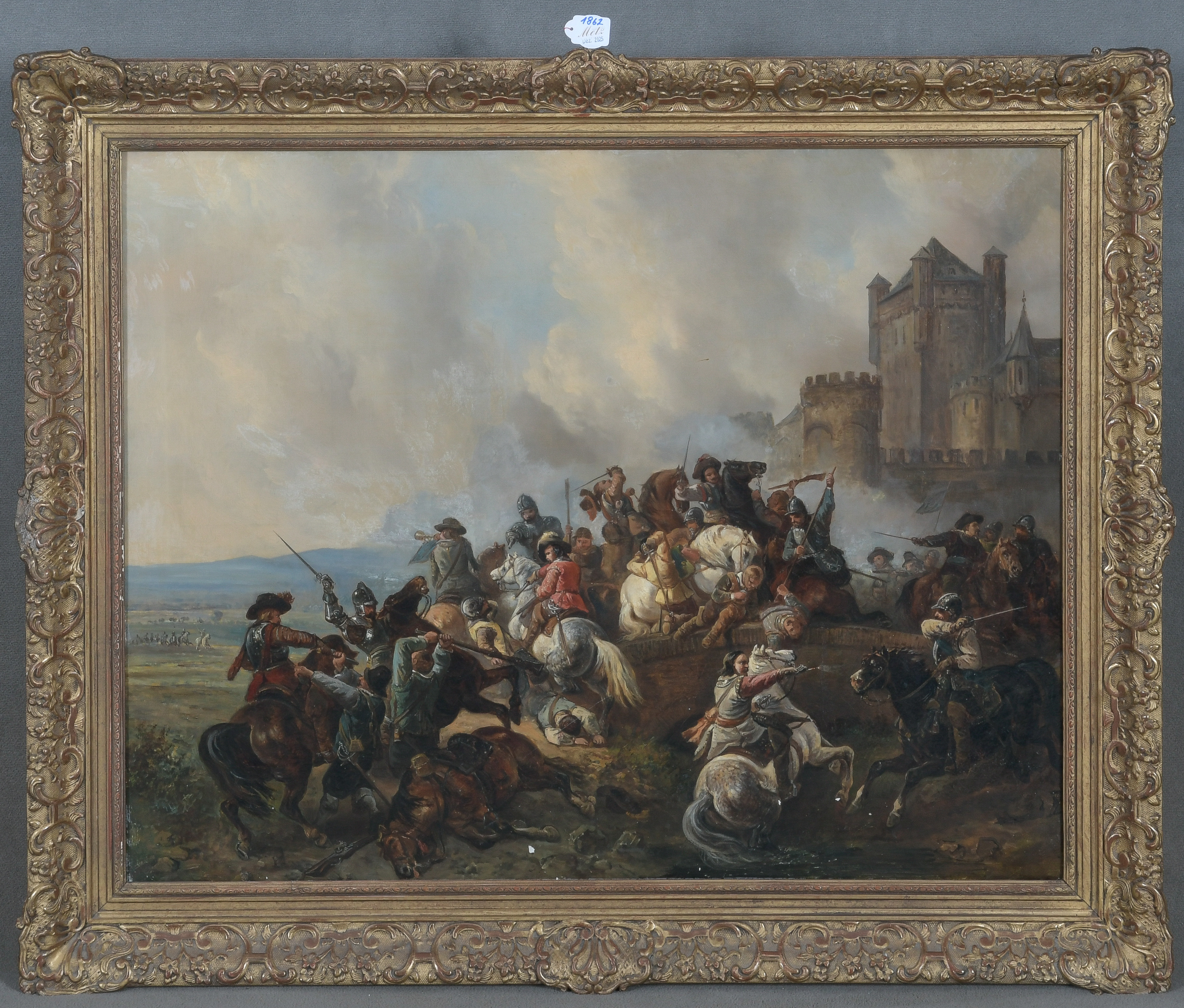 - Katalog-Nr: 1862Jan van Huchtenburgh (1647-1733) attrib. Bataillenszene, wohl Schlacht bei Alkmaar. Öl/Lw., doubliert, gerahmt, 65 x 80 cm.o.L.