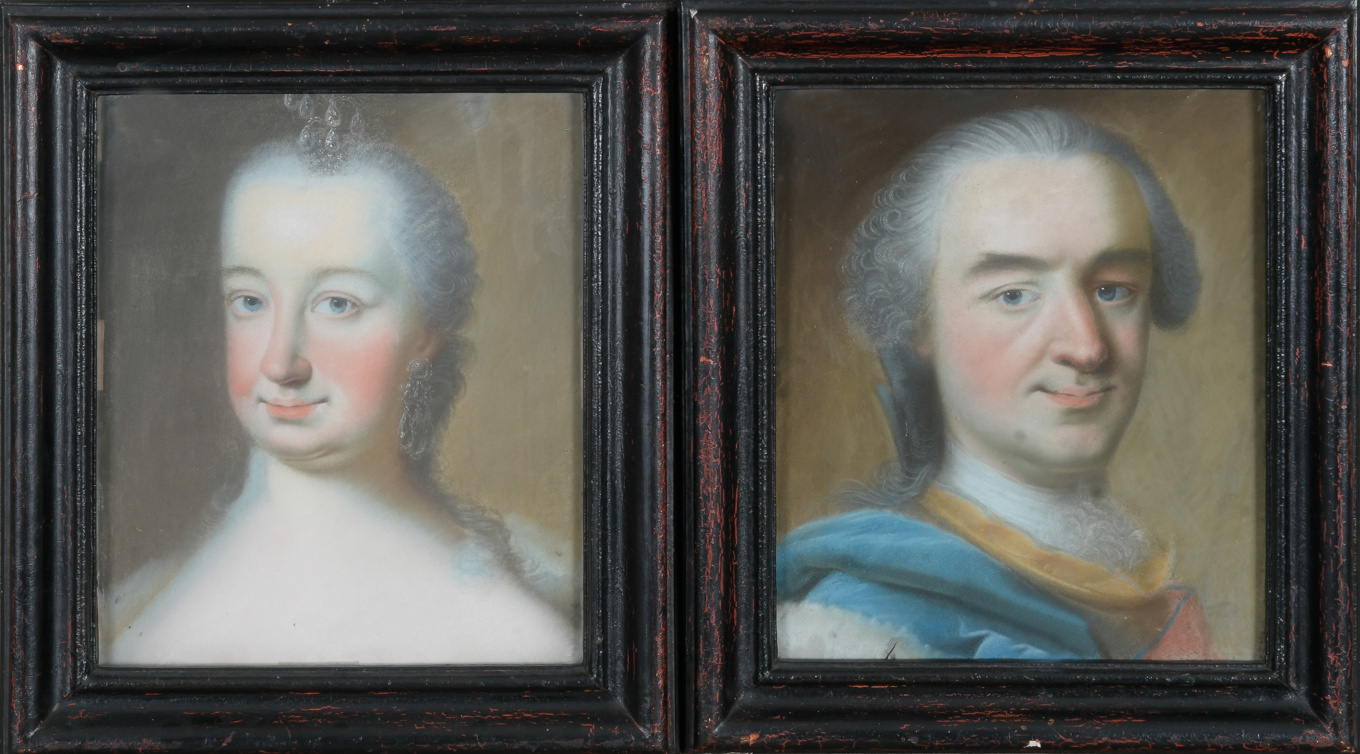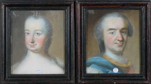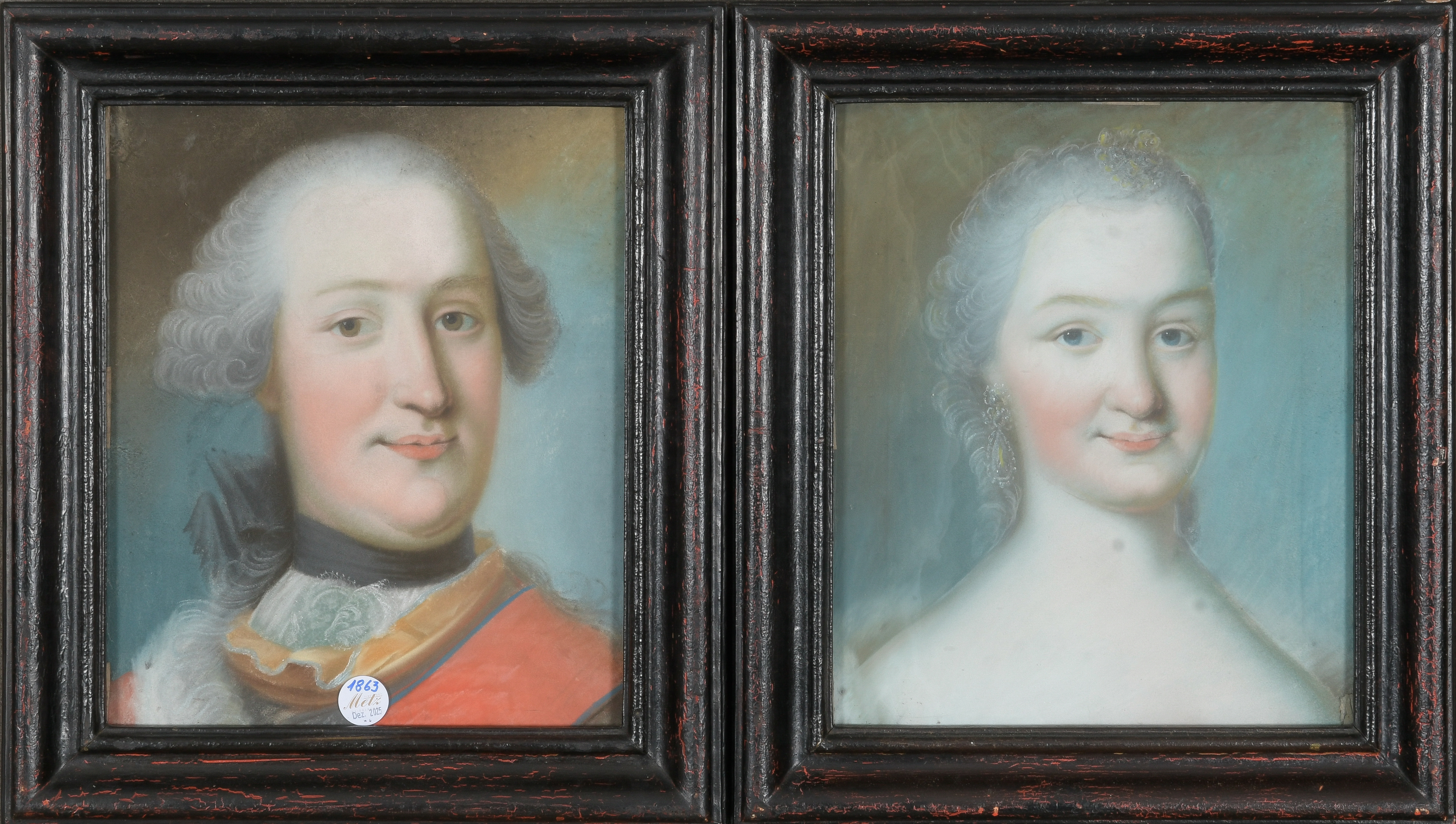 - Katalog-Nr: 1870Maler des 18. Jhs. Porträt von Carl Theodor und seiner Gemahlin Elisabeth Auguste von der Pfalz. Zwei Pastelle, hi./Gl. gerahmt, je 38 x 32 cm.o.L.