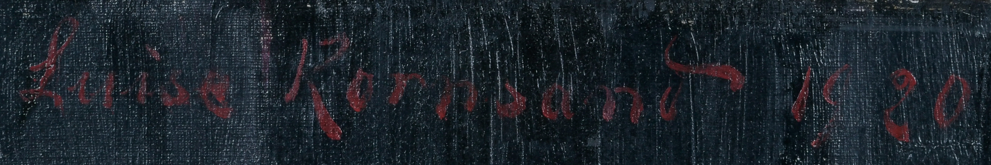 - Katalog-Nr: 1864Luise Kornsand (1876-1962). Stillleben mit Obst, Zinnteller und -schale, Glasbecher und Steinzeugkrug. Öl/Lw., li./u./sign./dat. 1920, gerahmt, 62 x 66 cm. (Rahmen besch.)o.L.
