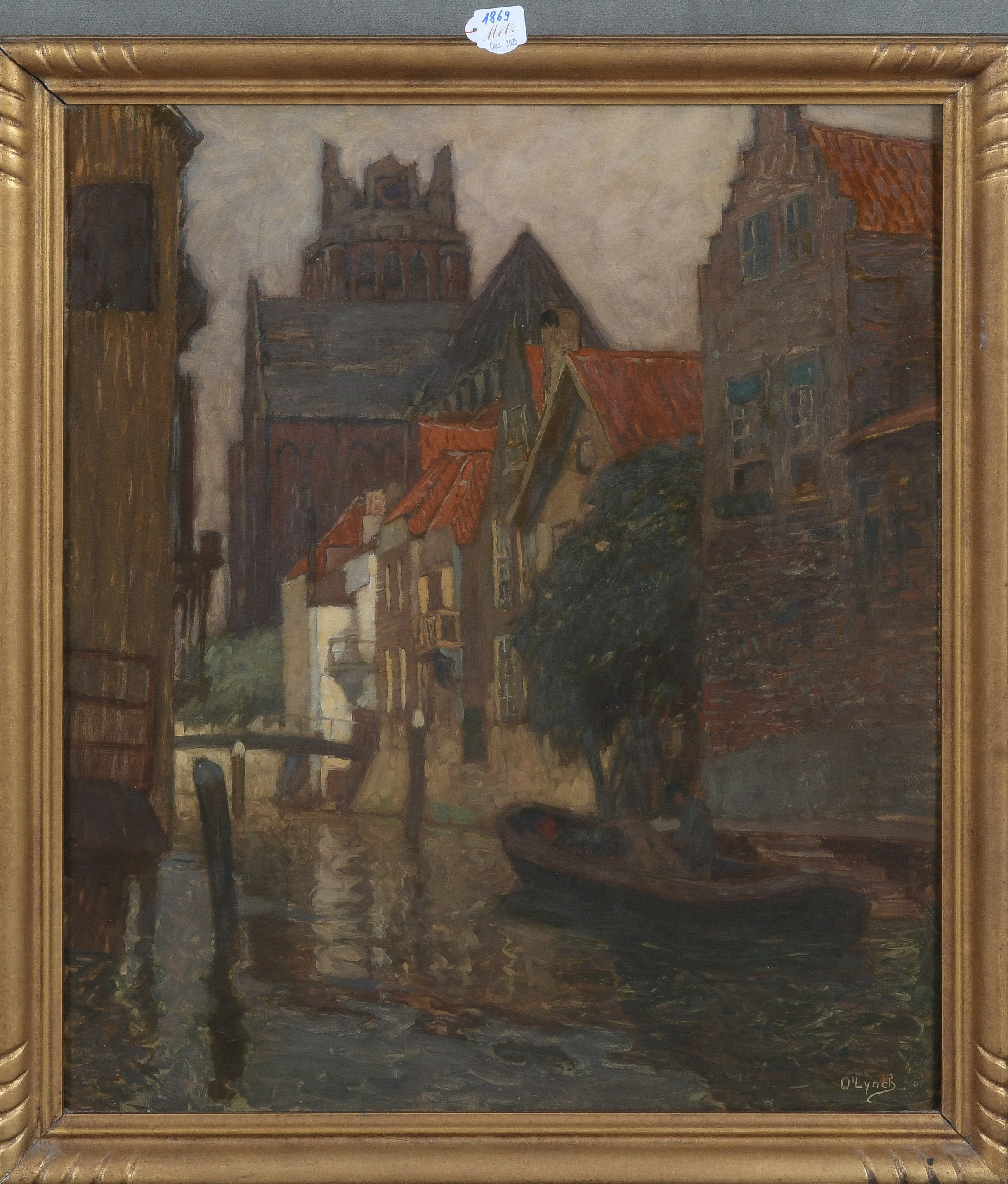 - Katalog-Nr: 1869Carl O'Lynch of Town (1869-1942). Ansicht der mächtigen Kathedrale (Groote Kerk) von Dordrecht aus dem Blickwinkel eines Kahnfahrers im Licht der untergehenden Sonne. Öl/Lw., aufgezogen, re./u./sign., gerahmt, 68 x 58 cm.o.L.