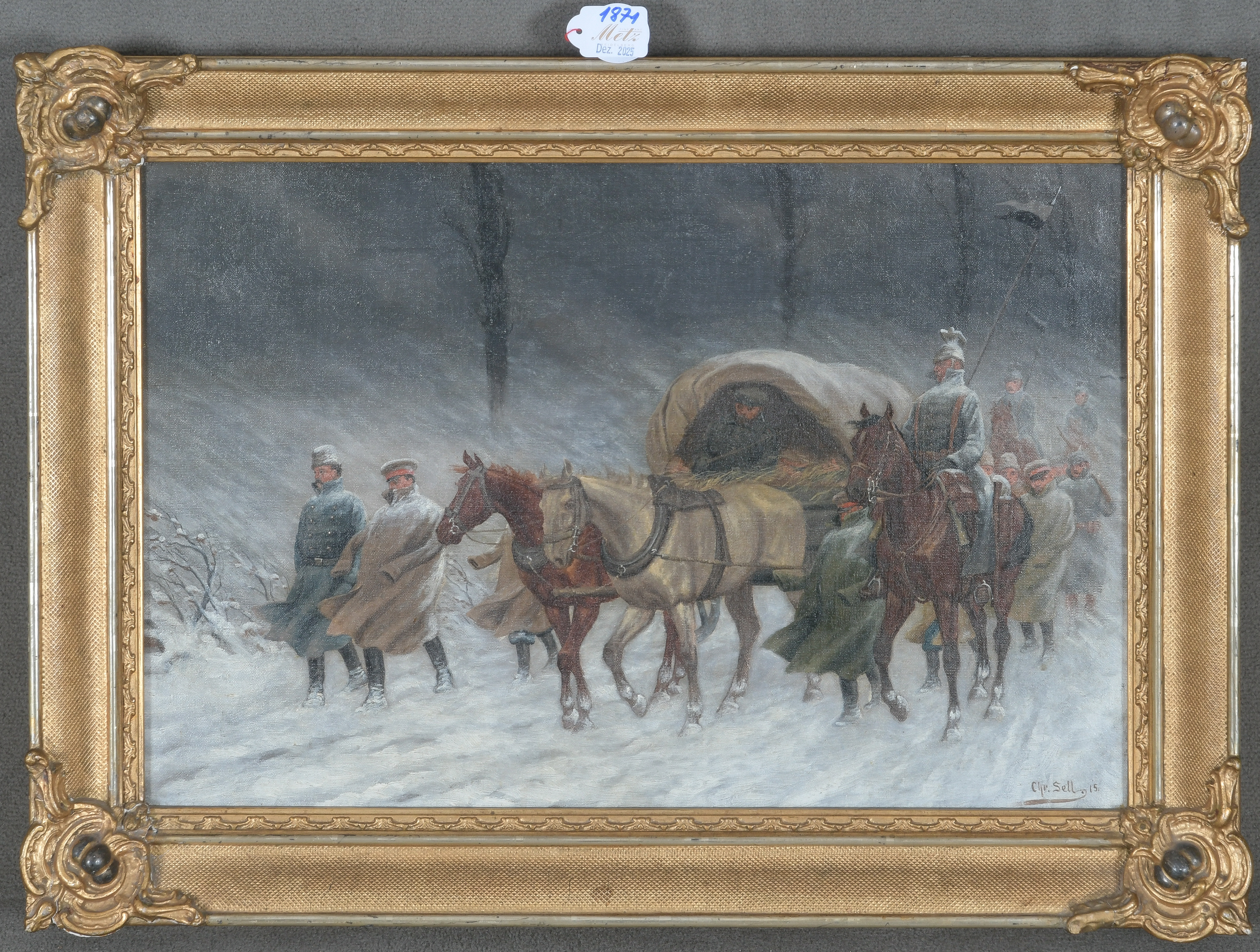 - Katalog-Nr: 1871Christian Sell II (1856-1925). Soldaten zu Fuß und zu Pferd mit Planwagen in Winterlandschaft. Öl/Lw., re./u./sign./dat. (19)15, gerahmt, 32,5 x 48,5 cm.o.L.
