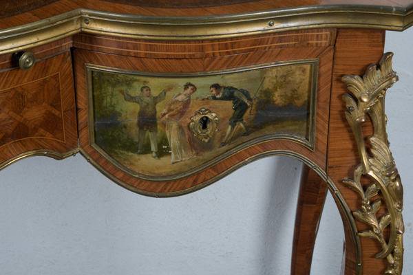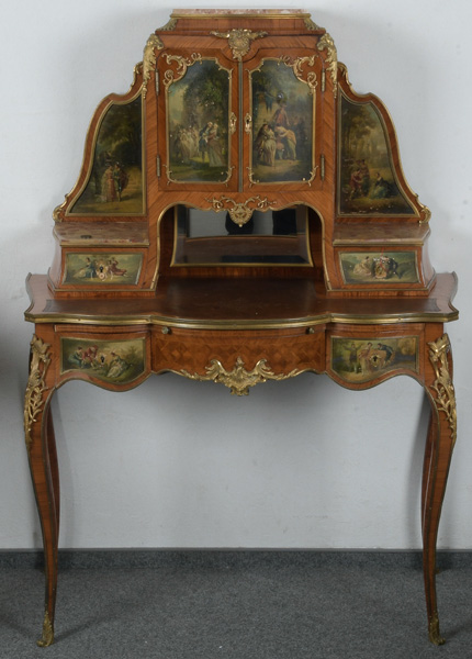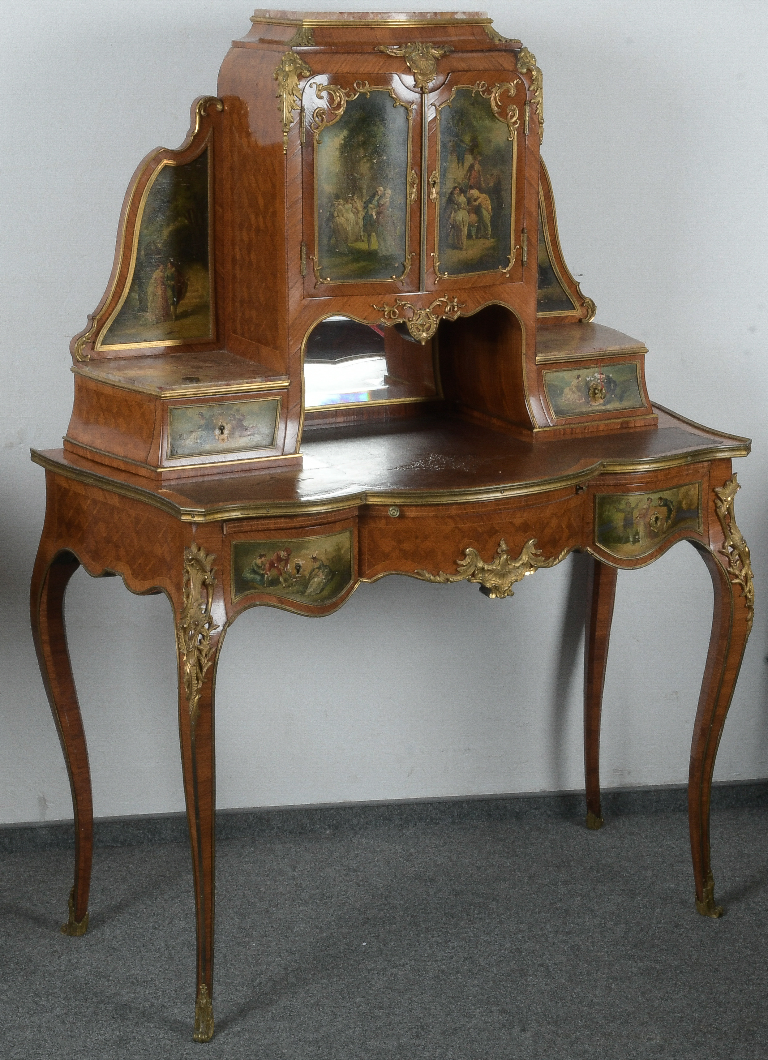 - Katalog-Nr: 1872Bonheur-du-Jour. Frankreich, wohl Werkstatt François Linke (1855-1946). Furniert mit verschiedenen Hölzern, marketiert mit Band-, Faden- und Würfeldekor, die Innenfelder bunt bemalt mit galanten Szenen, fein ausgeformte vergoldete Bronzebeschläge in Form von Akanthus, Maskaronen, Muscheln und Rocaillen; geschweifte Beine und Zarge, zweischübiger Tischkasten, allseits geschwungene Platte mit motivgeprägter Ledereinlage, herausziehbare Schreibplatte, ebenfalls mit Ledereinlage, zurückgesetzter, zweitüriger Kabinettaufsatz mit offenem Zwischenraum, Rückwand mit Facettspiegel, flankiert von je einem Schub, gekehlte, profilierte Abschlusskante mit eingelegter rot-weißer Marmorplatte, H=137 cm, B=96 cm, T=47 cm.o.L.