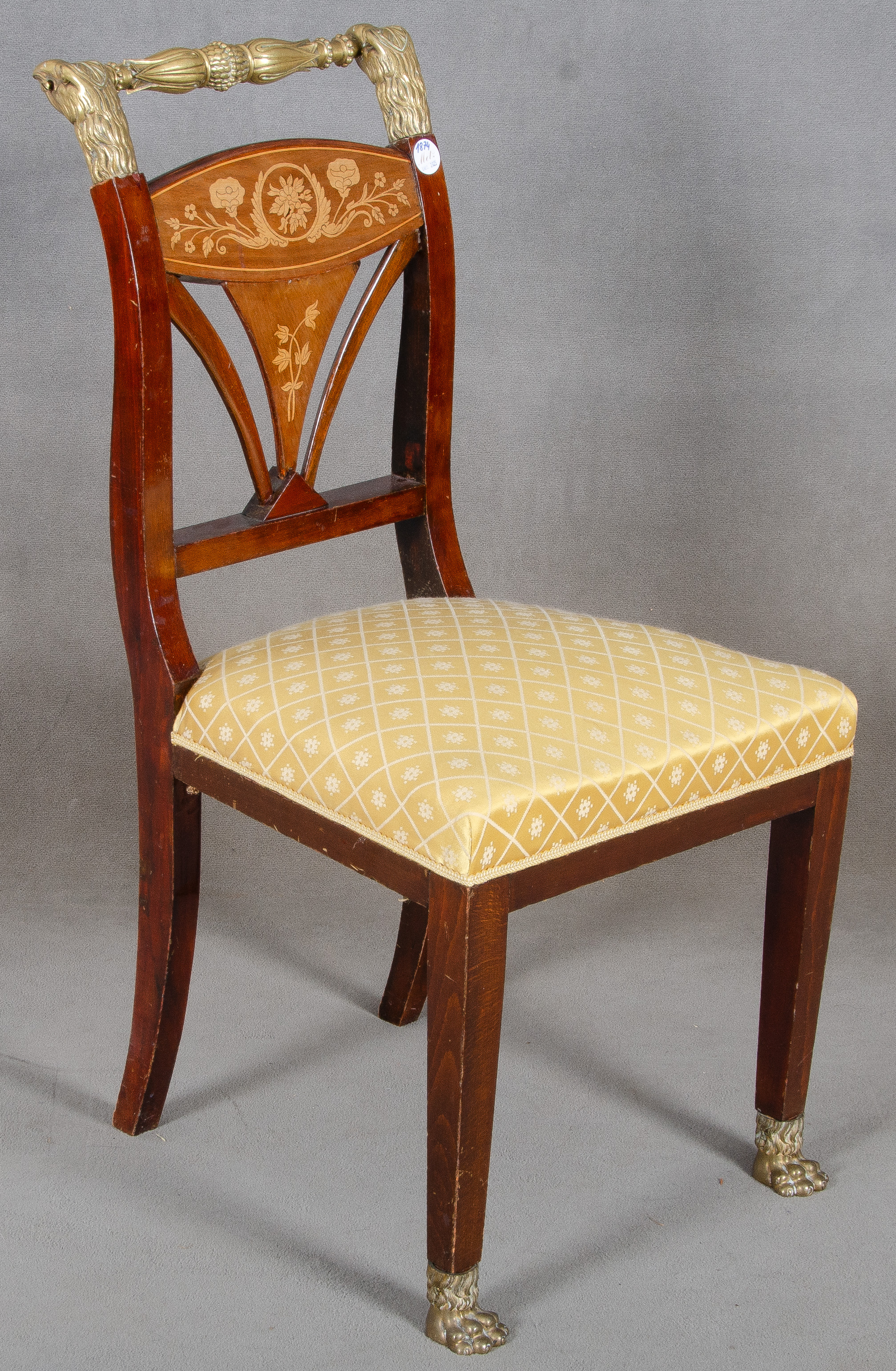 - Katalog-Nr: 1874Biedermeier-Stuhl. Wohl Russland 19. Jh. Massiv Mahagoni, teilw. furniert und marketiert mit Blüten und Blättern, fein ausgeformte Bronzebeschläge mit Greifvögeln, Knospen und Krallen; mit Vierkant- und Säbelbeinen sowie durchbrochener Fächerrückenlehne.o.L.