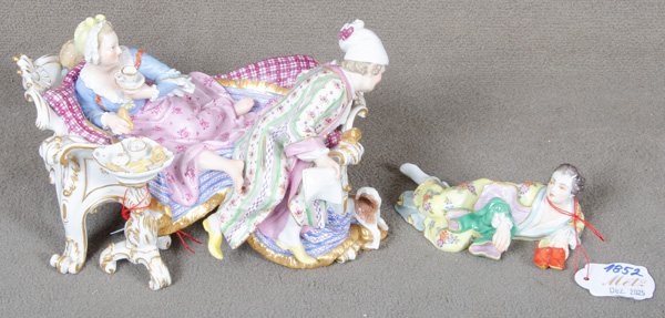 - Katalog-Nr: 1851Musizierendes Paar mit Mopshund. Meissen 19. Jh. Porzellan, bunt bemalt, mit Goldrand; am Boden unterglasurblaue Schwertermarke, Formnummer „W. 56“, Staffiererziffer „2.“, Modell nach Johann Joachim Kaendler, H=15,2 cm, B=19,5 cm, T=13 cm. (min. rest.)o.L.