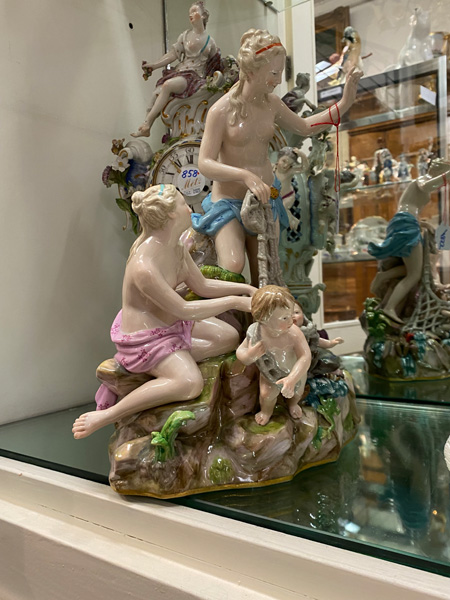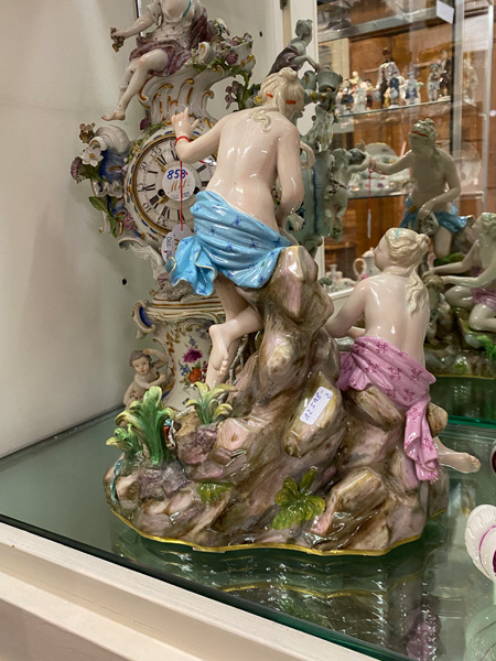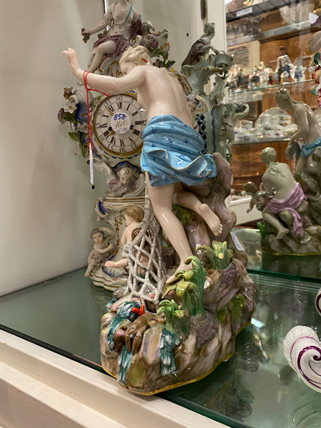 - Katalog-Nr: 1852„Der entdeckte Liebhaber“. Meissen 19. Jh. Porzellan, bunt bemalt; am Boden unterglasurblaue Schwertermarke, Formnummer „D.64“ , Staffiererziffer „32.“. Modell nach Johann Joachim Kaendler, H=12,5 cm.o.L.