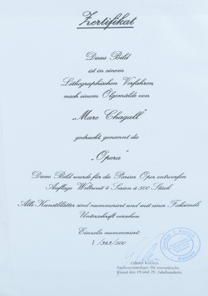 - Katalog-Nr: 1866Marc Chagall (1887-1985). „Opera“. Farblithographie 343/500, re./u./sign., mit Passepartout hi./Gl. gerahmt, D=51 cm. Mit Zertifikat von Günter Keilich.o.L.