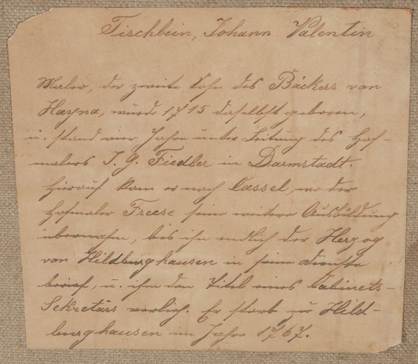 - Katalog-Nr: 1868Johann Valentin Tischbein (1715-1767/68) attrib. Porträt eines Herrn. Öl/Lw., doubliert, verso auf Etikett bez., gerahmt, 83 x 68,5 cm.o.L.