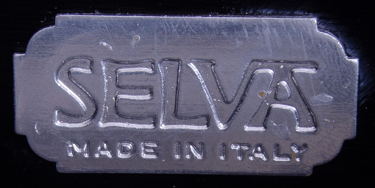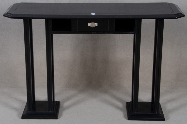- Katalog-Nr: 1876Konsole. Italien, Selva 20. Jh. Massivholz, schwarz lackiert; acht Säulen auf zwei quadratischen Fußplatten, einschübiger Tischkasten, an der Innenseite des Schubes Metallschild mit Firmenlogo, überstehende, profilierte, rechteckige Platte mit abgeschrägte Kanten, H=77 cm, B=116 cm, T=41 cm.o.L.