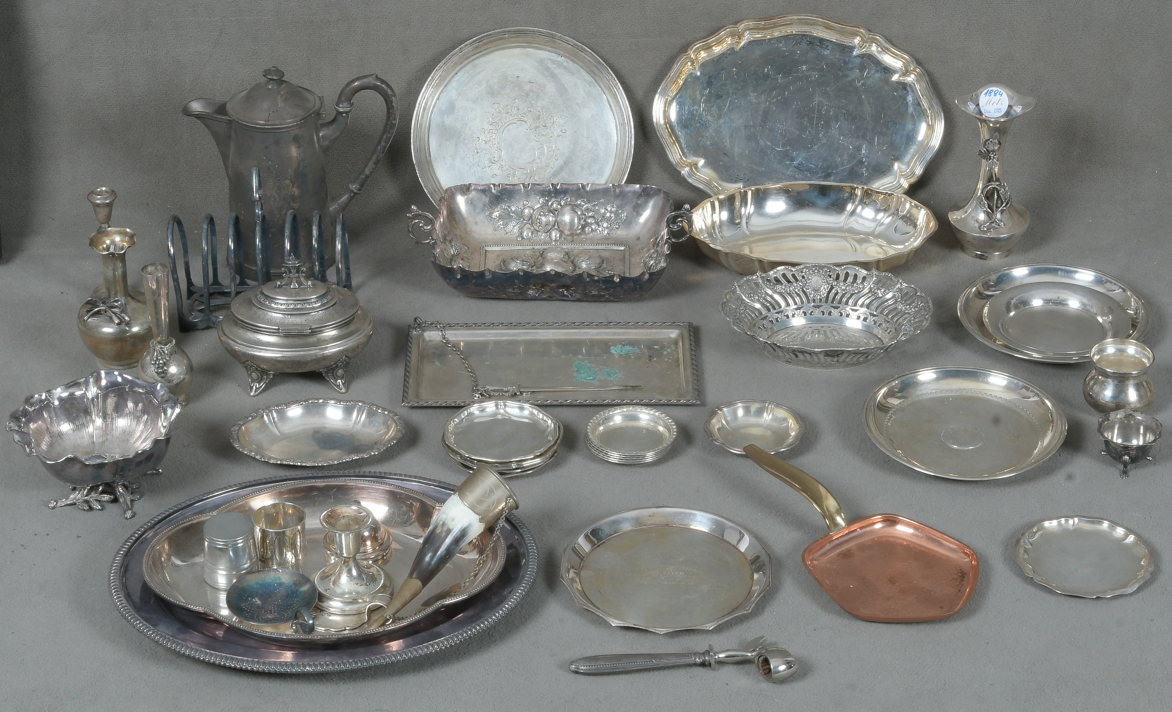 - Katalog-Nr: 1884Konvolut Silber, ca. 3.000 g, und Versilbertes, u.a. Deckeldosen, Kanne, Leuchter, Tabletts, Teller, Schalen und Vasen, H=2 bis 24 cm.o.L.