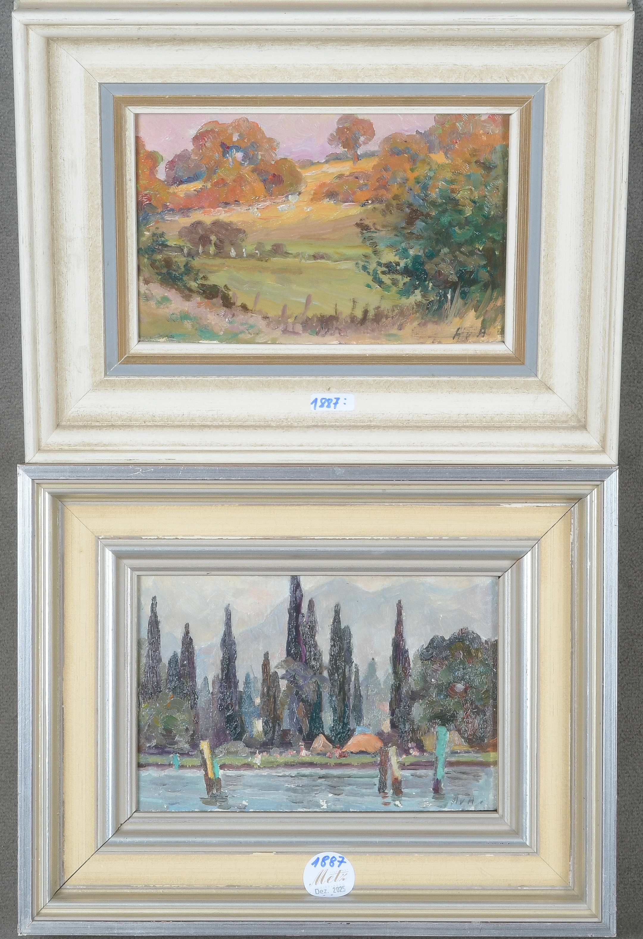 - Katalog-Nr: 1887Alexey von Assaulenko (1913-1989). Seelandschaft mit Segelbooten und Wiesenlandschaft. Zwei Öl/Malkarton, re./u./sign., gerahmt, 16 x 22 cm.o.L.