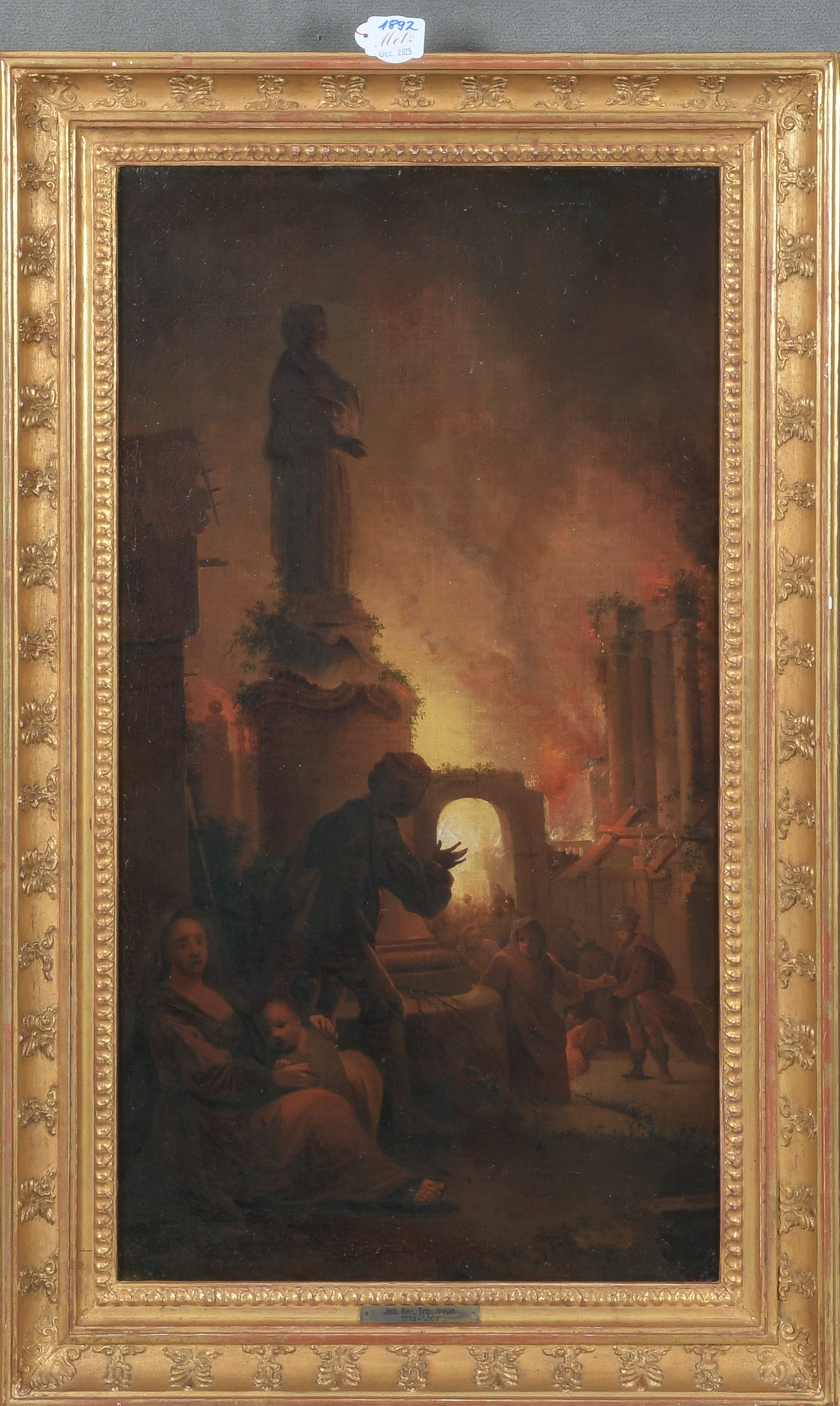 - Katalog-Nr: 1892Johann Georg Trautmann (1713-1769) attrib. „Nächtliche Feuersbrunst in der Stadt“. Öl/Lw., doubliert, gerahmt, 64 x 35 cm. Provenienz: Kunsthandlung Karl-Theodor Stahl, Mannheim 1987, für DM 9.500,00.o.L.