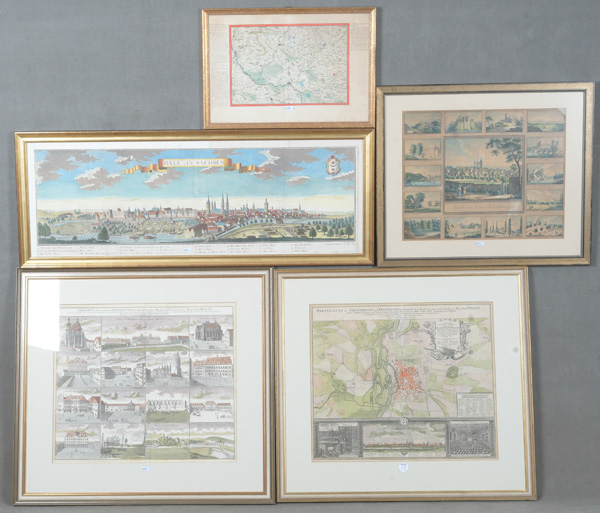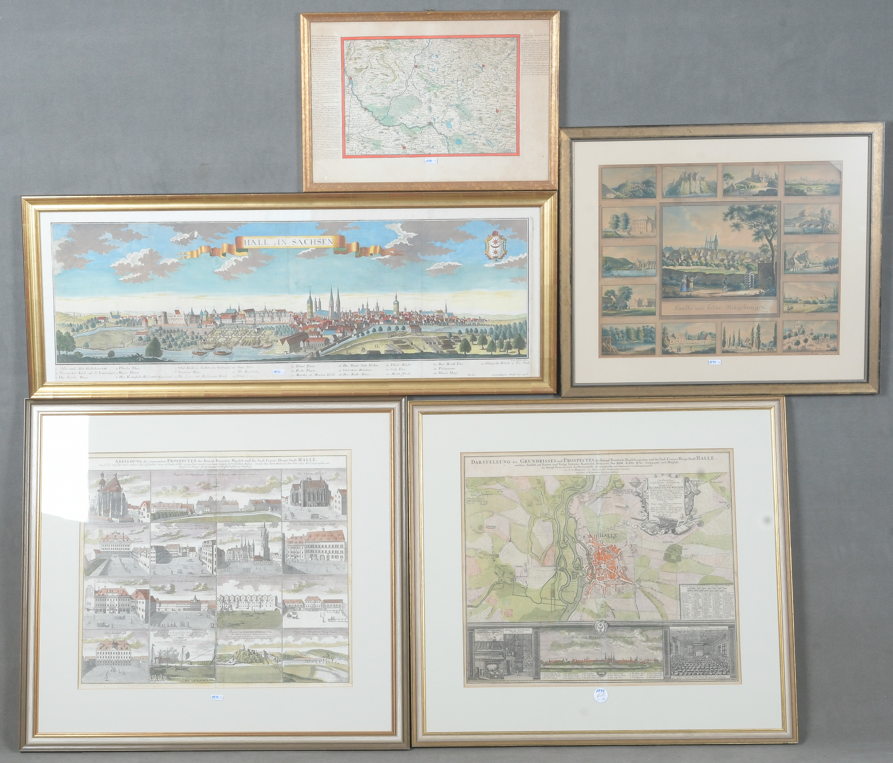 - Katalog-Nr: 1894Johann Baptist Homann (1664-1724) / Georg Balthasar Probst (1732-1801) u.a. Karten und Ansichten von Halle. Aquatinta / colorierte Kupferstiche, re./u. bzw. o./mittig sign, 24 x 36 bis 48 x 56 cm.o.L.