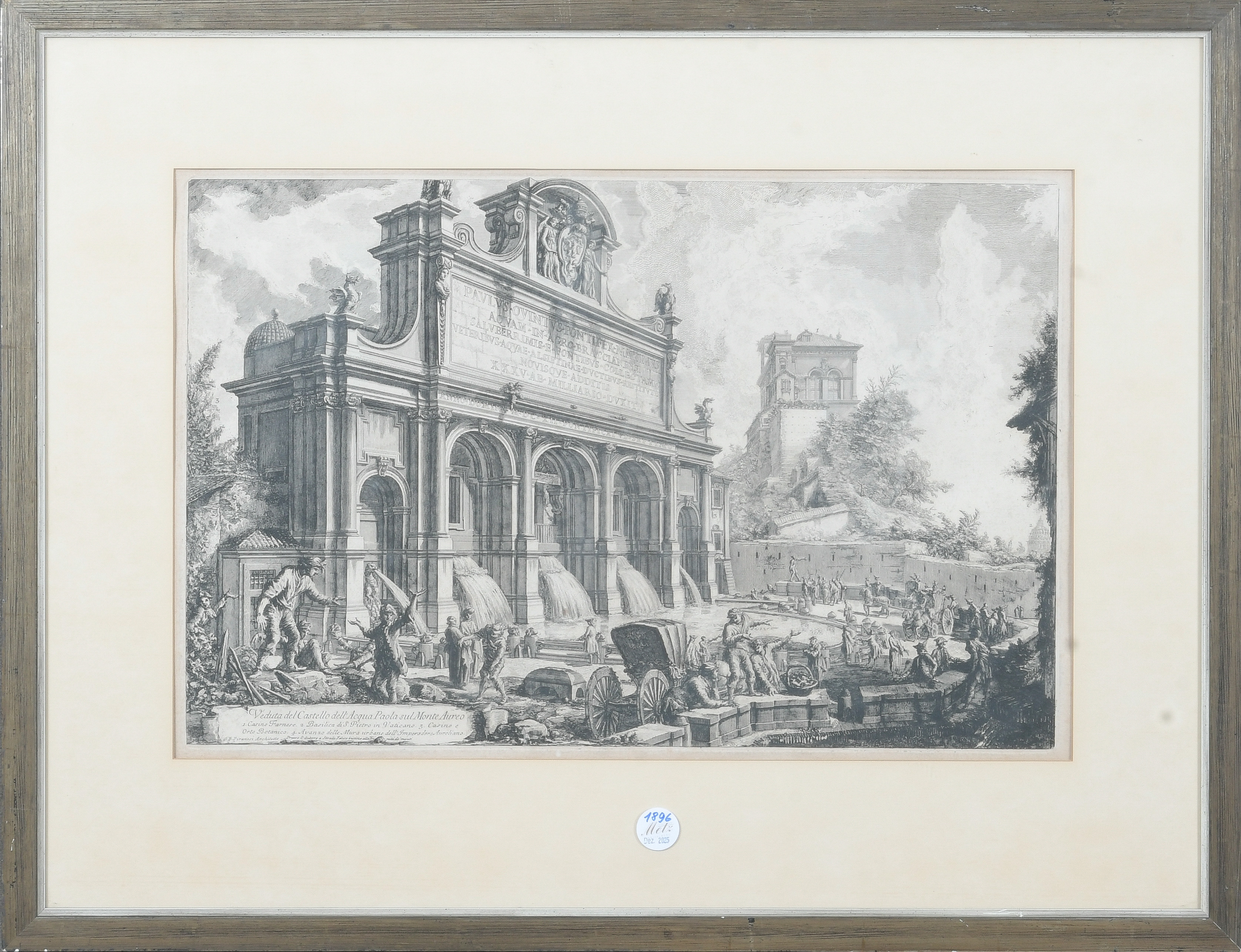 - Katalog-Nr: 1896Giovanni Battista Piranesi (1720-1778). „Veduta di Roma“. Kupferstich, li./u./sign., mit Passepartout hi./Gl. gerahmt, 40 x 61 cm.o.L.