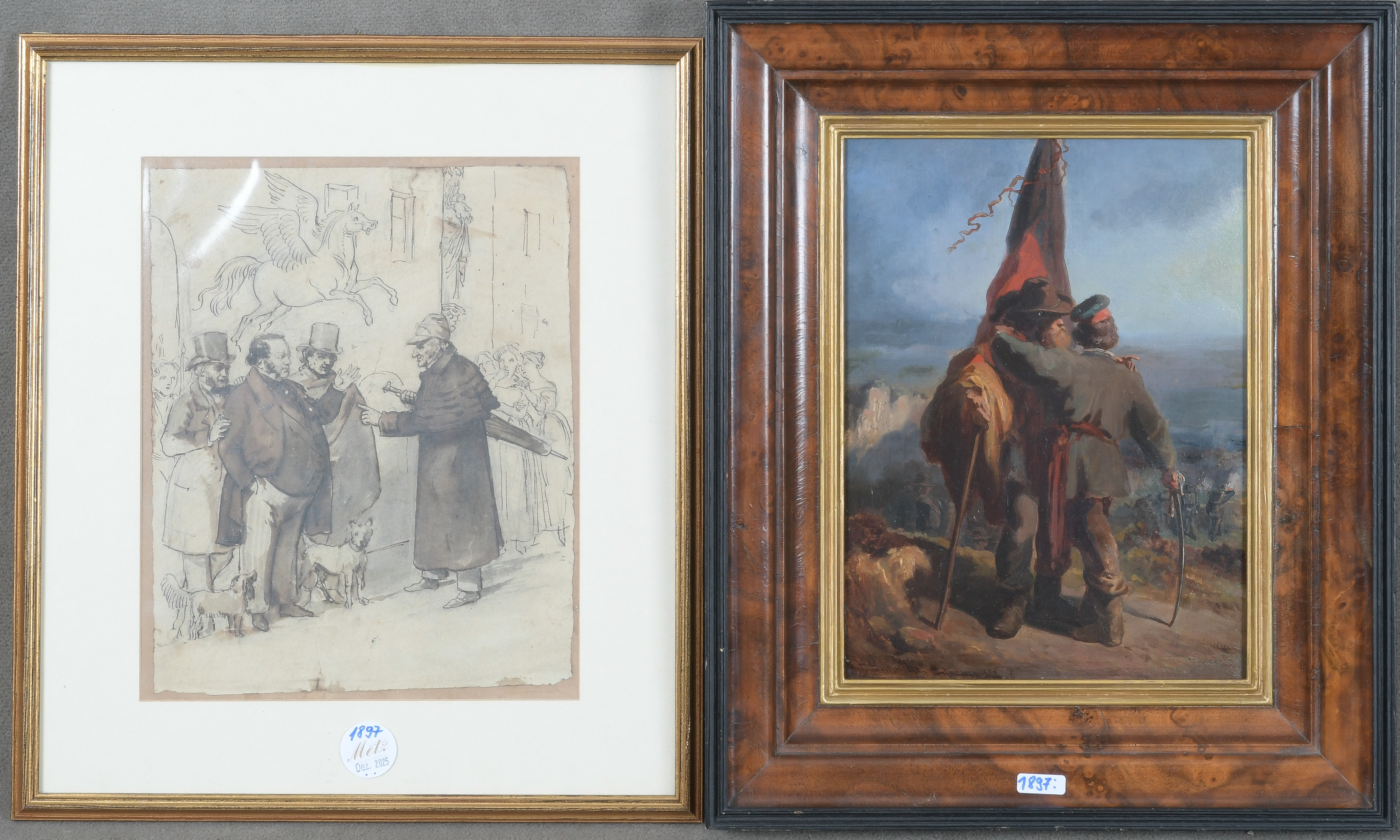 - Katalog-Nr: 1897Karl Hermann Schmolze (1823-1864) attrib. Dichter in München. Tuschfederzeichnung, verso bez. mit Passepartout hi./Gl. gerahmt, 28 x 22; dazu Kriegsheimkehrer. Öl/Holz, li./u./sign./dat. 1862, bez. „Antwerpen“, 30 x 20 cm.o.L.
