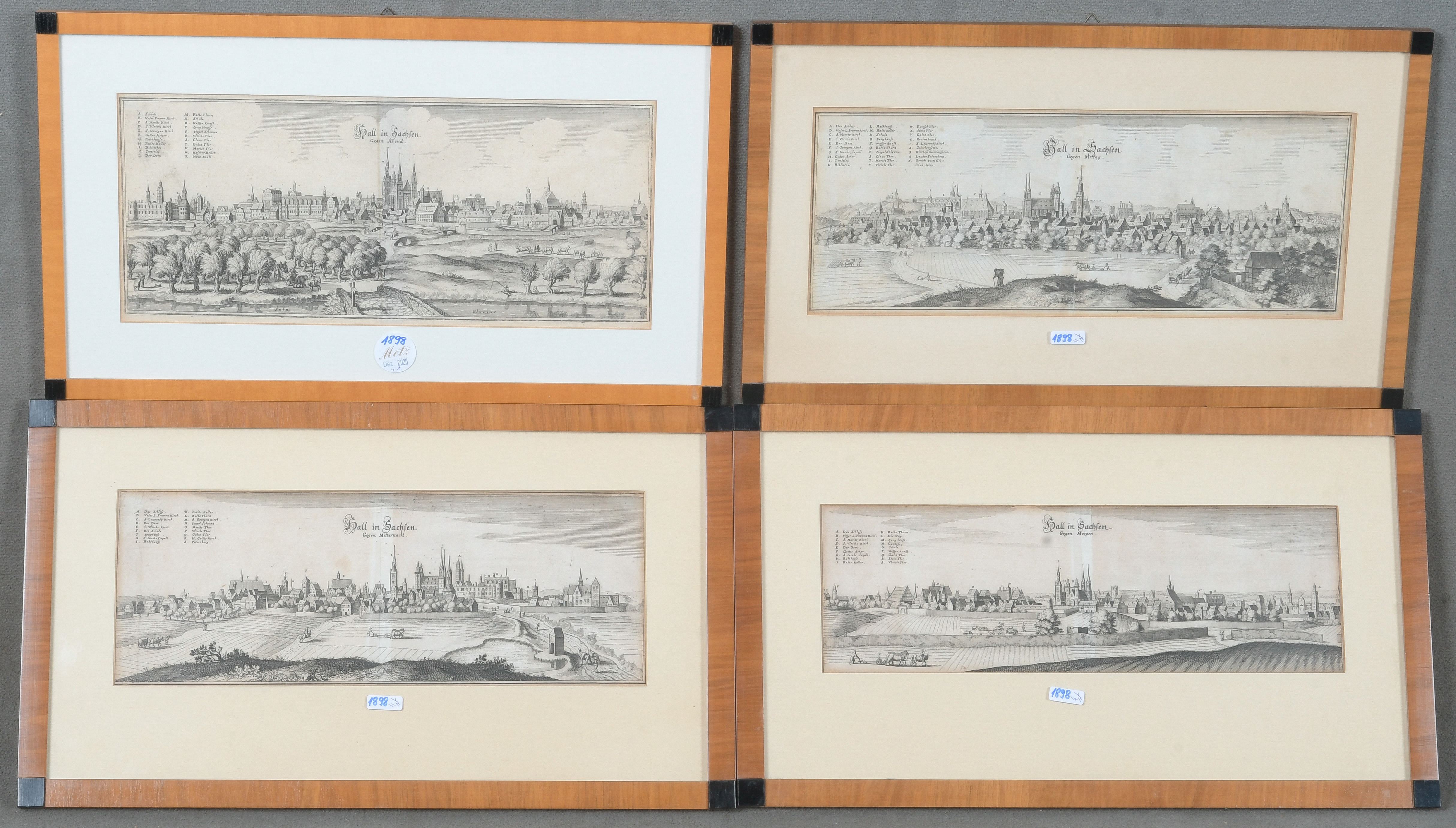 - Katalog-Nr: 1898Graphiker des 18. Jhs. Vier Ansichten von Halle aus den vier Himmelsrichtungen . Kupferstich, mit Passepartout hi./Gl. gerahmt, 15,5 x 37 cm. (zwei besch.)o.L.