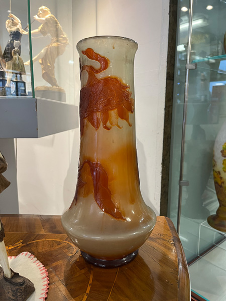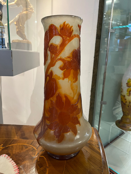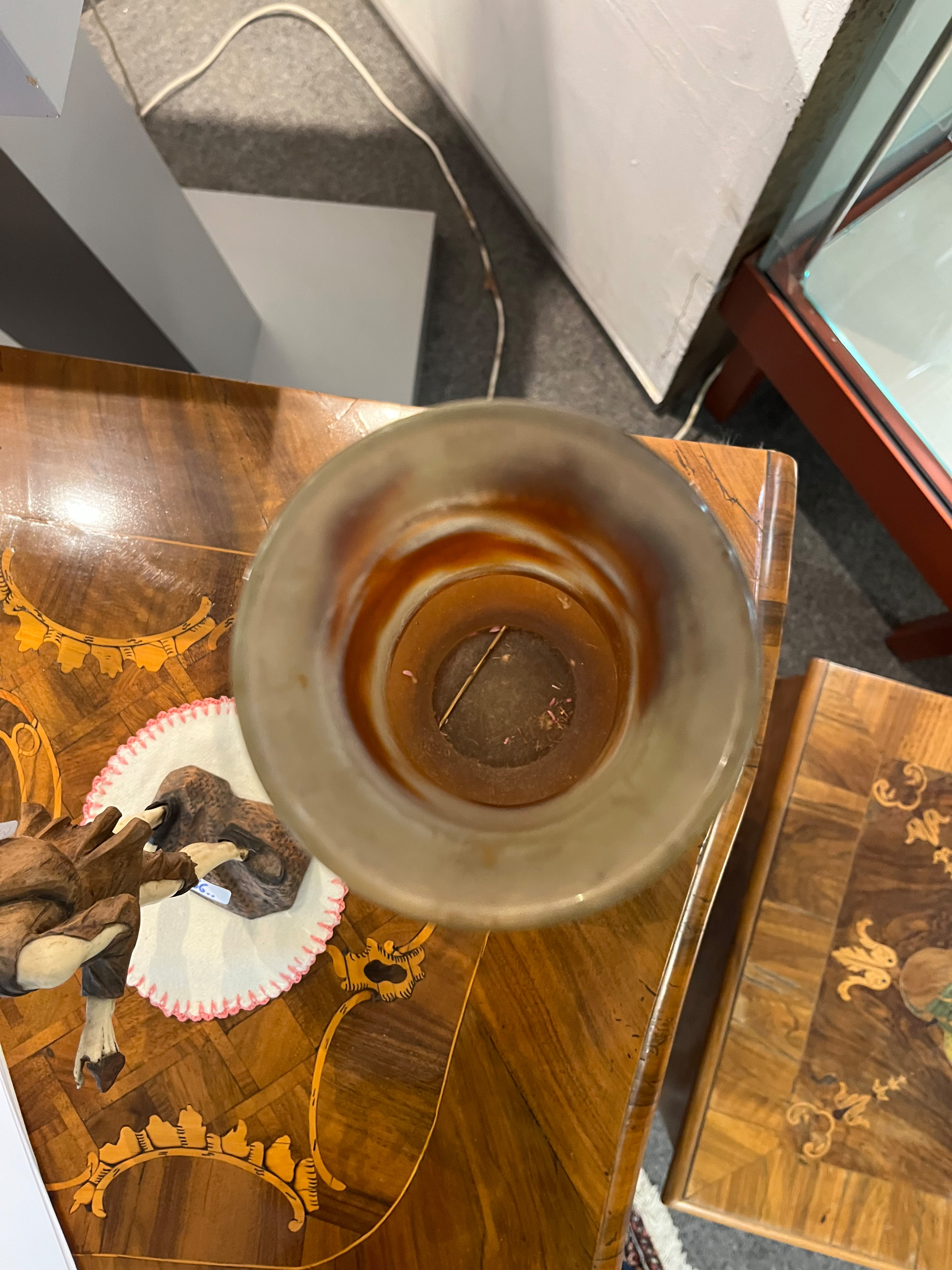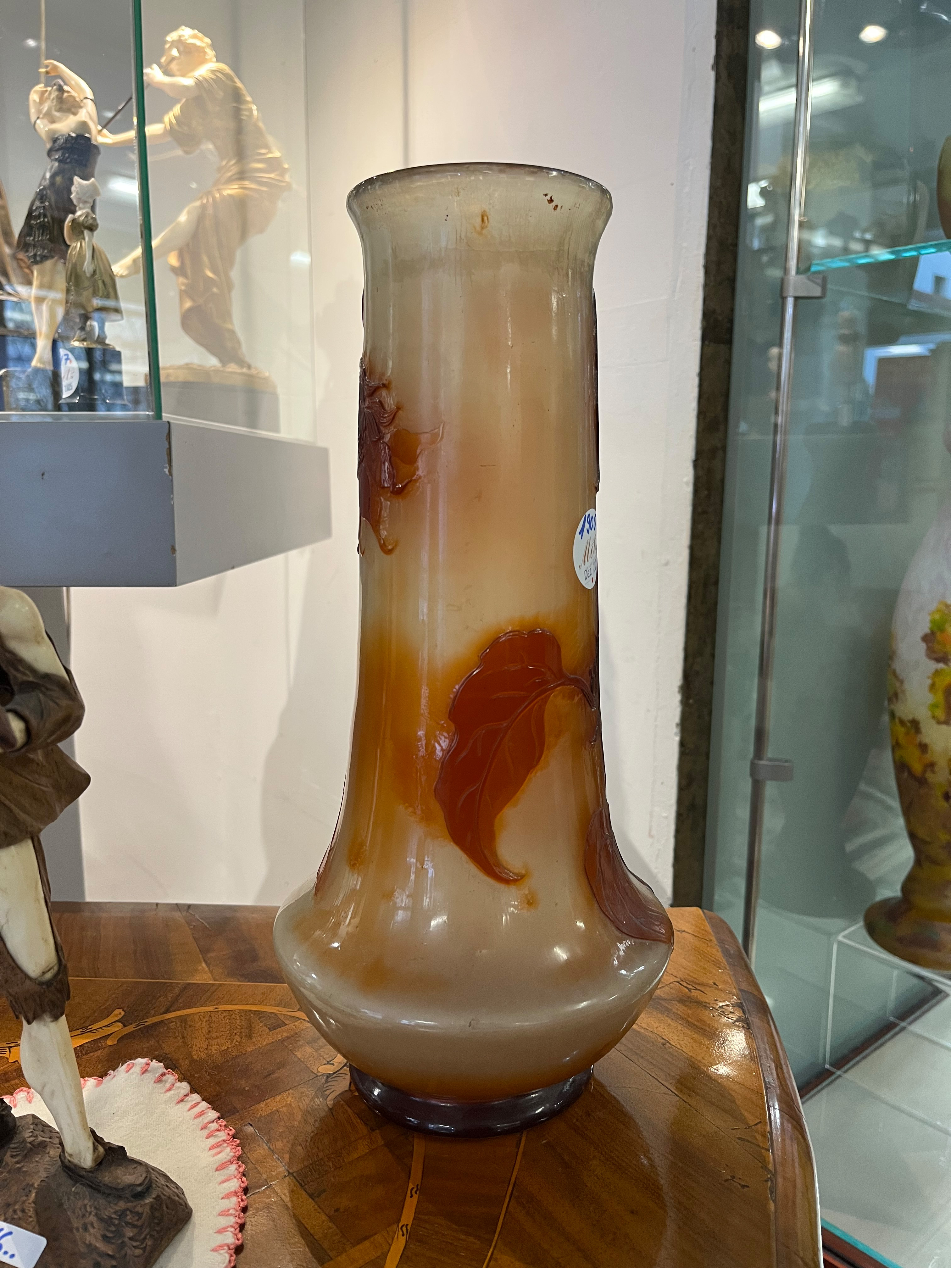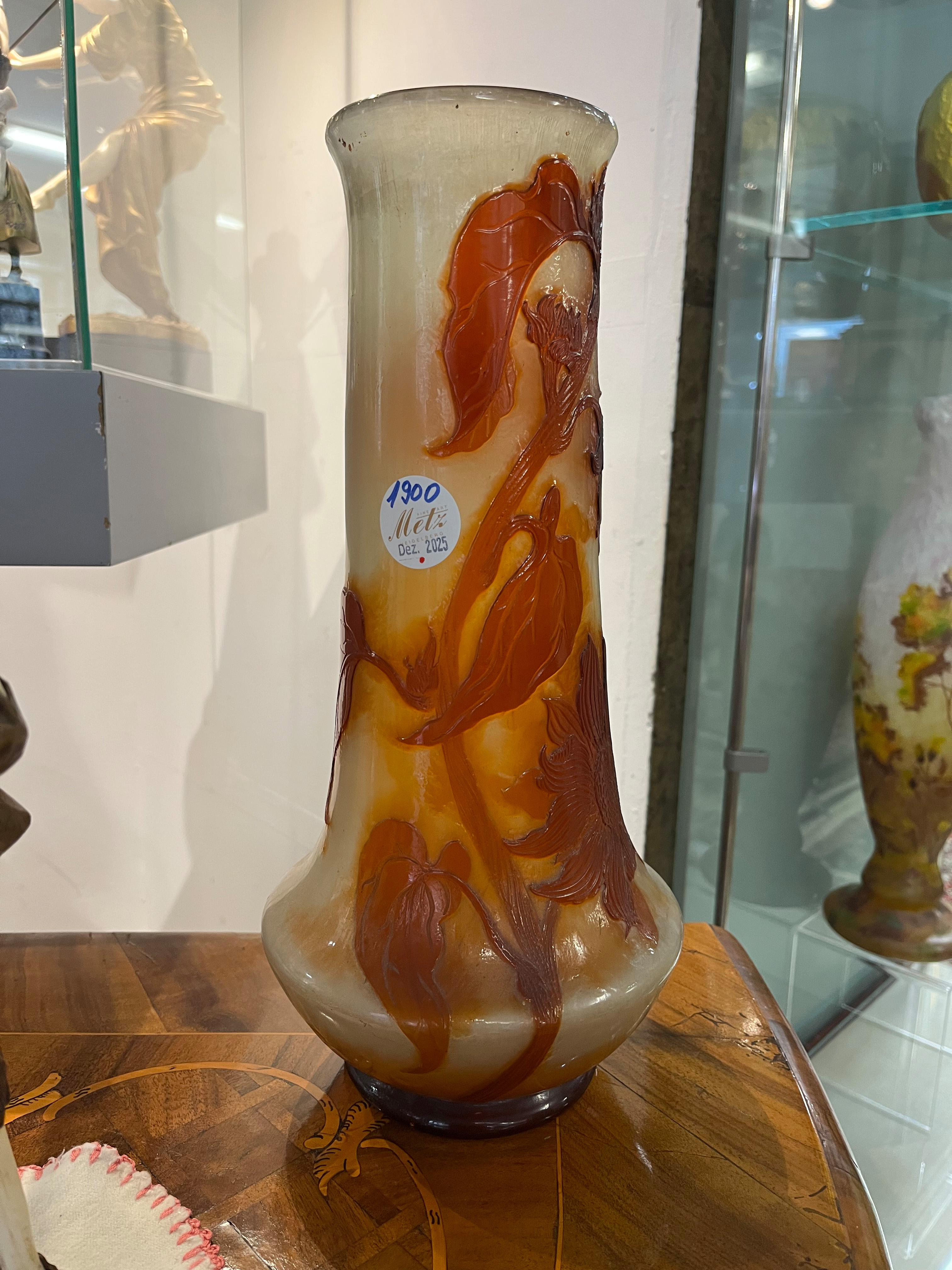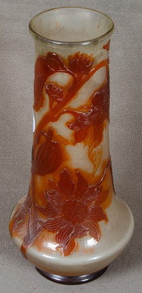 - Katalog-Nr: 1900Jugendstil-Vase. Nancy, Émile Gallé um 1900. Farbloses Glas, farbig überfangen, umlaufend floral geschnitten und feuerpoliert; an der Wandung sign., H=35,5 cm.o.L.
